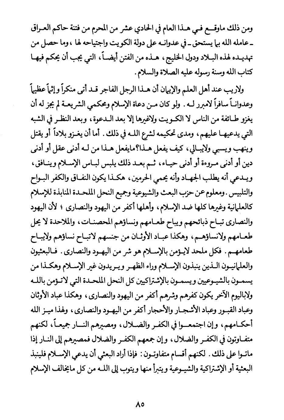 ولا ريب عند أهل العلم والإيمان أن هذا الرجل الفاجر قد أتى منكرا وإثما عظيما وعدوانا سافرا لا مبرر له. ولو كان من دعاة الإسلام ومحكمي الشريعة لم يجز له أن يغزو طائفة من الناس لا الكويت ولا غيرها إلا بعد الدعوة وبعد النظر في الشبه التي يدعيها عليهم ومدى تحكيمه لشرع الله في ذلك. أما أن يغزو بلادا أو يقتل وينهب ويسبي ولا يبالي كيف يفعل هذا؟ ما يفعل هذا من له أدنى عقل أو أدنى دين أو أدنى مروءة أو أدنى حياء، ثم بعد ذلك يلبس لباس الإسلام وينافق، ويدعي أنه يطلب الجهاد، وأنه يحمي الحرمين، هكذا يكون النفاق والكفر البواح والتلبيس.