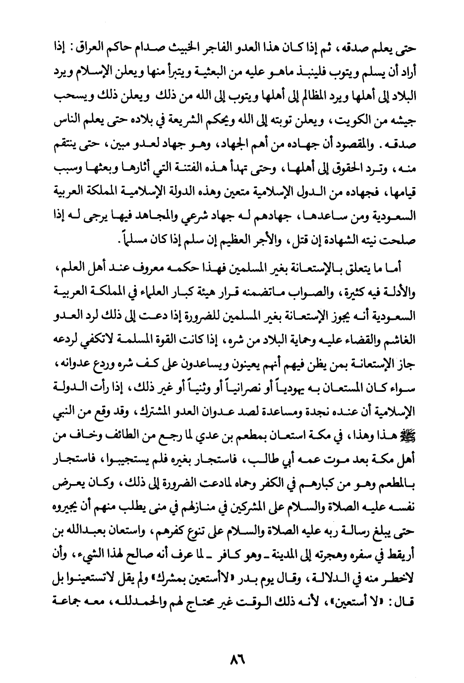 والمقصود أن جهاده من أهم الجهاد وهو جهاد لعدو مبين حتى ينتقم منه وترد الحقوق إلى أهلها، وحتى تهدأ هذه الفتنة التي أثارها وبعثها وسبب قيامها، فجهاده من الدول الإسلامية متعين، وهذه الدولة الإسلامية المملكة العربية السعودية ومن ساعدها جهادهم له جهاد شرعي، والمجاهد فيها يرجى له إذا صلحت نيته الشهادة إن قتل والأجر العظيم إن سلم إذا كان مسلما. أما ما يتعلق بالاستعانة بغير المسلمين فهذا حكمه معروف عند أهل العلم، والأدلة فيه كثيرة، والصواب ما تضمنه قرار هيئة كبار العلماء في المملكة العربية السعودية: أنه يجوز الاستعانة بغير المسلمين للضرورة إذا دعت إلى ذلك لرد العدو الغاشم والقضاء عليه وحماية البلاد من شر، إذا كانت القوة المسلمة لا تكفي لردعه جاز الاستعانة بمن يظن فيهم أنهم يعينون ويساعدون على كف شره وردع عدوانه، سواء كان المستعان به يهوديا أو نصرانيا أو وثنيا أو غير ذلك إذا رأت الدولة الإسلامية أن عنده نجدة ومساعدة لصد عدوان العدو المشترك. وقد وقع من النبي صلى الله عليه وسلم هذا، وهذا في مكة استعان بمطعم بن عدي لما رجع من الطائف وخاف من أهل مكة بعد موت عمه أبي طالب فاستجار بغيره فلم يستجيبوا فاستجار بالمطعم وهو من كبارهم في الكفر وحماه لما دعت الضرورة إلى ذلك، وكان يعرض نفسه عليه الصلاة والسلام على المشركين في منازلهم في منى يطلب منهم أن يجيروه حتى يبلغ رسالة ربه عليه الصلاة والسلام على تنوع كفرهم، واستعان بعبد الله بن أريقط في سفره وهجرته إلى المدينة - وهو كافر - لما عرف أنه صالح لهذا الشيء وأن لا خطر منه في الدلالة، وقال يوم بدر: «لا أستعين بمشرك (¬1) » ولم يقل لا تستعينوا بل قال: لا أستعين؛ لأنه ذلك الوقت غير محتاج لهم والحمد لله معه جماعة