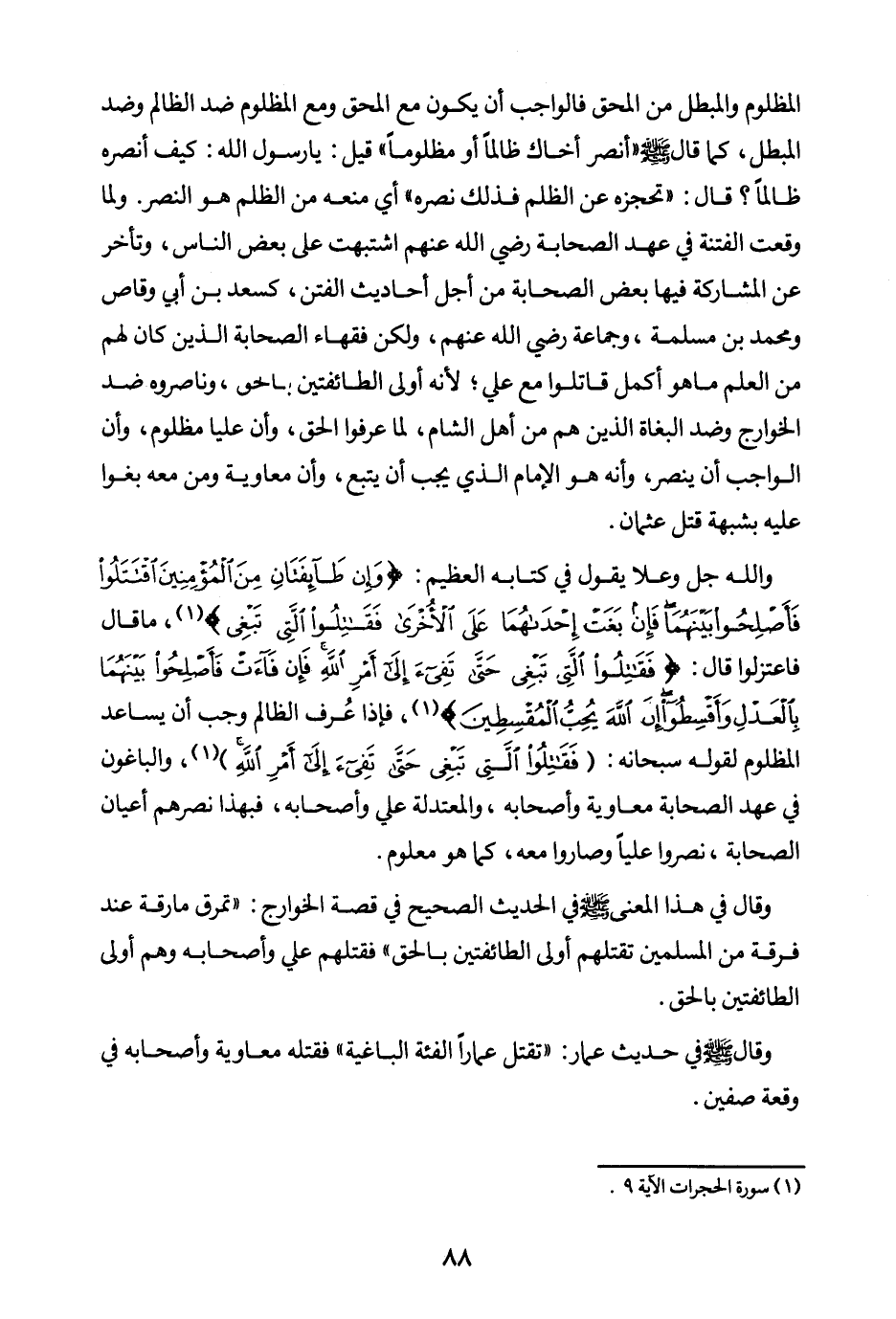 ولما وقعت الفتنة في عهد الصحابة رضي الله عنهم اشتبهت على بعض الناس وتأخر عن المشاركة فيها بعض الصحابة؛ من أجل أحاديث الفتن، كسعد بن أبي وقاص، ومحمد بن مسلمة، وجماعة رضي الله عنهم، ولكن فقهاء الصحابة الذين كان لهم من العلم ما هو أكمل قاتلوا مع علي؛ لأنه أولى الطائفتين بالحق، وناصروه ضد الخوارج، وضد البغاة الذين هم من أهل الشام؛ لما عرفوا الحق، وأن عليا مظلوم، وأن الواجب أن ينصر، وأنه هو الإمام الذي يجب أن يتبع، وأن معاوية ومن معه بغوا عليه بشبهة قتل عثمان. والله جل وعلا يقول في كتابه العظيم: {وَإِنْ طَائِفَتَانِ مِنَ الْمُؤْمِنِينَ اقْتَتَلُوا فَأَصْلِحُوا بَيْنَهُمَا فَإِنْ بَغَتْ إِحْدَاهُمَا عَلَى الْأُخْرَى فَقَاتِلُوا الَّتِي تَبْغِي} (¬2) ما قال فاعتزلوا؛ قال: {فَقَاتِلُوا الَّتِي تَبْغِي حَتَّى تَفِيءَ إِلَى أَمْرِ اللَّهِ فَإِنْ فَاءَتْ فَأَصْلِحُوا بَيْنَهُمَا بِالْعَدْلِ وَأَقْسِطُوا إِنَّ اللَّهَ يُحِبُّ الْمُقْسِطِينَ} (¬3) فإذا عرف الظالم وجب أن يساعد المظلوم لقوله سبحانه: {فَقَاتِلُوا الَّتِي تَبْغِي حَتَّى تَفِيءَ إِلَى أَمْرِ اللَّهِ} (¬4) والباغون في عهد الصحابة معاوية وأصحابه والمعتدلة علي وأصحابه فبهذا نصرهم أعيان الصحابة نصروا عليا وصاروا معه كما هو معلوم. وقال في هذا المعنى صلى الله عليه وسلم في الحديث الصحيح في قصة الخوارج: «تمرق مارقة عند فرقة من المسلمين تقتلهم أولى الطائفتين بالحق (¬5) » فقتلهم علي وأصحابه وهم أولى الطائفتين بالحق. وقال صلى الله عليه وسلم في حديث عمار: «تقتل عمارا الفئة الباغية (¬6) » فقتله معاوية وأصحابه في وقعة صفين.