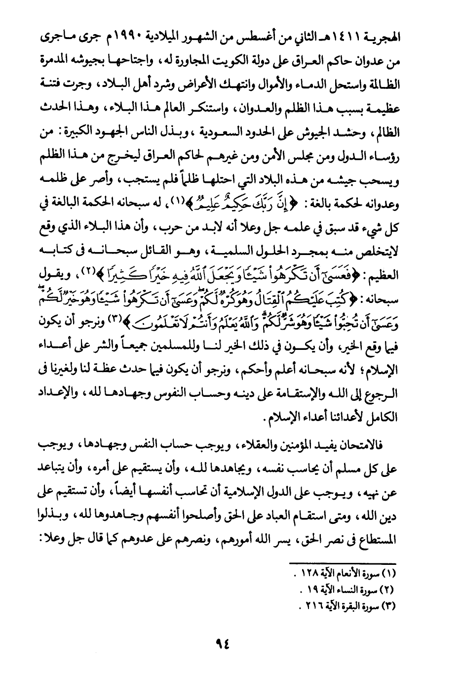 الهجرية 1411 هـ الثاني من أغسطس من الشهور الميلادية 1990 م جرى ما جرى من عدوان حاكم العراق على دولة الكويت المجاورة له، واجتاحها بجيوشه المدمرة الظالمة، واستحل الدماء والأموال، وانتهك الأعراض، وشرد أهل البلاد، وجرت فتنة عظيمة بسبب هذا الظلم والعدوان، واستنكر العالم هذا البلاء وهذا الحدث الظالم، وحشد الجيوش على الحدود السعودية، وبذل الناس الجهود الكبيرة: من رؤساء الدول ومن مجلس الأمن ومن غيرهم لحاكم العراق ليخرج من هذا الظلم ويسحب جيشه من هذه البلاد التي احتلها ظلما، فلم يستجب، وأصر على ظلمه وعدوانه؛ لحكمة بالغة: إن ربك حكيم عليم له سبحانه الحكمة البالغة في كل شيء، قد سبق في علمه جل وعلا أنه لا بد من حرب، وأن هذا البلاء الذي وقع لا يتخلص منه بمجرد الحلول السلمية، وهو القائل سبحانه في كتابه العظيم: {فَعَسَى أَنْ تَكْرَهُوا شَيْئًا وَيَجْعَلَ اللَّهُ فِيهِ خَيْرًا كَثِيرًا} (¬1) ويقول سبحانه: {كُتِبَ عَلَيْكُمُ الْقِتَالُ وَهُوَ كُرْهٌ لَكُمْ وَعَسَى أَنْ تَكْرَهُوا شَيْئًا وَهُوَ خَيْرٌ لَكُمْ وَعَسَى أَنْ تُحِبُّوا شَيْئًا وَهُوَ شَرٌّ لَكُمْ وَاللَّهُ يَعْلَمُ وَأَنْتُمْ لَا تَعْلَمُونَ} (¬2) ونرجو أن يكون فيما وقع الخير وأن يكون في ذلك الخير لنا وللمسلمين جميعا والشر على أعداء الإسلام؛ لأنه سبحانه أعلم وأحكم، ونرجو أن يكون فيما حدث عظة لنا ولغيرنا في الرجوع إلى الله والاستقامة على دينه وحساب النفوس وجهادها لله والإعداد الكامل لأعدائنا أعداء الإسلام.