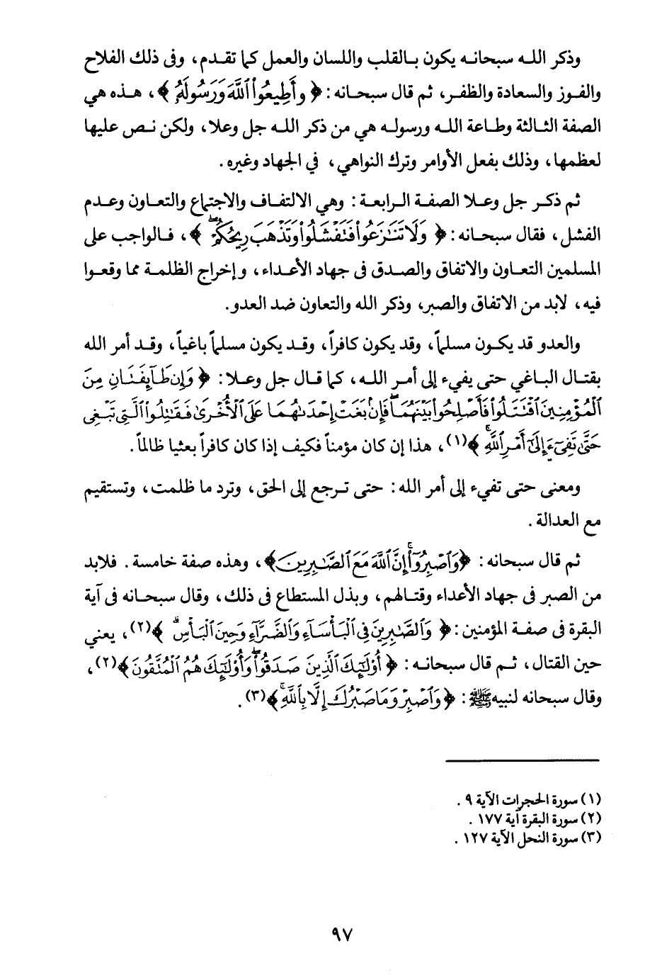 ومعنى حتى تفيء إلى أمر الله: حتى ترجع إلى الحق، وترد ما ظلمت، وتستقيم مع العدالة. ثم قال سبحانه: {وَاصْبِرُوا إِنَّ اللَّهَ مَعَ الصَّابِرِينَ} (¬4) وهذه صفة خامسة. فلا بد من الصبر في جهاد الأعداء وقتالهم، وبذل المستطاع في ذلك، وقال سبحانه في آية البقرة في صفة المؤمنين: {وَالصَّابِرِينَ فِي الْبَأْسَاءِ وَالضَّرَّاءِ وَحِينَ الْبَأْسِ} (¬5) يعني حين القتال، ثم قال سبحانه: {أُولَئِكَ الَّذِينَ صَدَقُوا وَأُولَئِكَ هُمُ الْمُتَّقُونَ} (¬6) وقال سبحانه لنبيه صلى الله عليه وسلم: {وَاصْبِرْ وَمَا صَبْرُكَ إِلَّا بِاللَّهِ} (¬7)