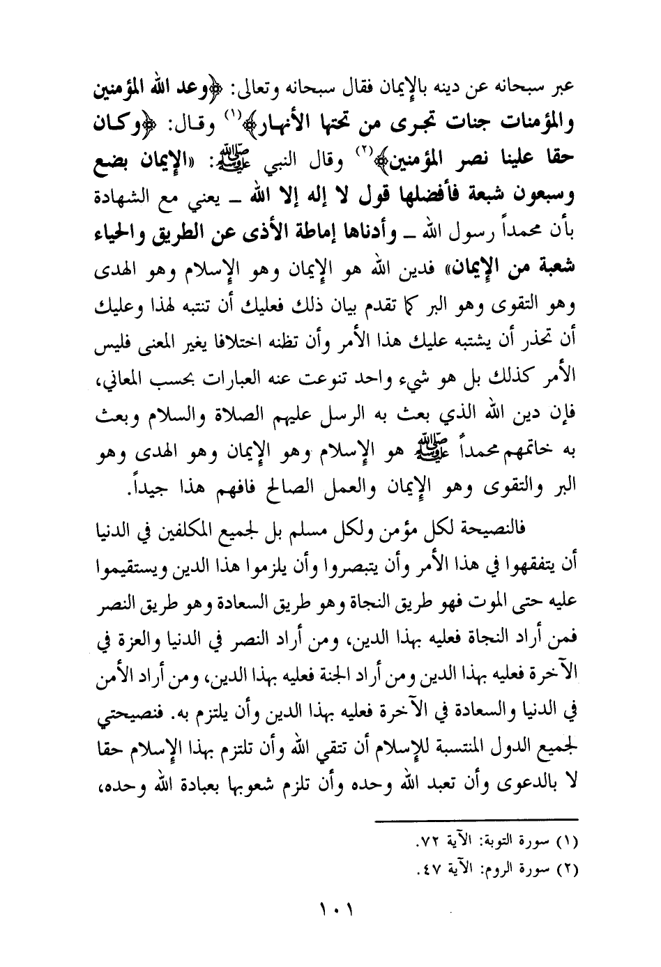 فالنصيحة لكل مؤمن ولكل مسلم بل لجميع المكلفين في الدنيا أن يتفقهوا في هذا الأمر وأن يتبصروا وأن يلزموا هذا الدين ويستقيموا عليه حتى الموت فهو طريق النجاة وهو طريق السعادة وهو طريق النصر فمن أراد النجاة فعليه بهذا الدين، ومن أراد النصر في الدنيا والعزة في الآخرة فعليه بهذا الدين ومن أراد الجنة فعليه بهذا الدين، ومن أراد الأمن في الدنيا والسعادة في الآخرة فعليه بهذا الدين وأن يلتزم به. فنصيحتي لجميع الدول المنتسبة للإسلام أن تتقي الله وأن تلتزم بهذا الإسلام حقا لا بالدعوى وأن تعبد الله وحده وأن تلزم شعوبها بعبادة الله وحده،