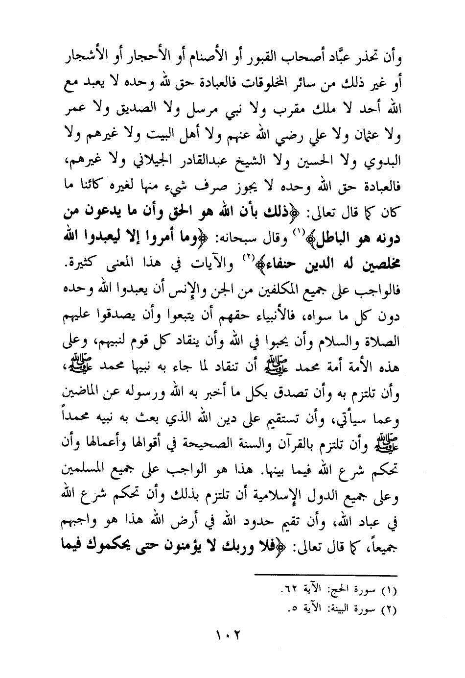 وأن تحذر عباد أصحاب القبور أو الأصنام أو الأحجار أو الأشجار أو غير ذلك من سائر المخلوقات فالعبادة حق لله وحده لا يعبد مع الله أحد لا ملك مقرب ولا نبي مرسل ولا الصديق ولا عمر ولا عثمان ولا علي رضي الله عنهم ولا أهل البيت ولا غيرهم ولا البدوي ولا الحسين ولا الشيخ عبد القادر الجيلاني ولا غيرهم.