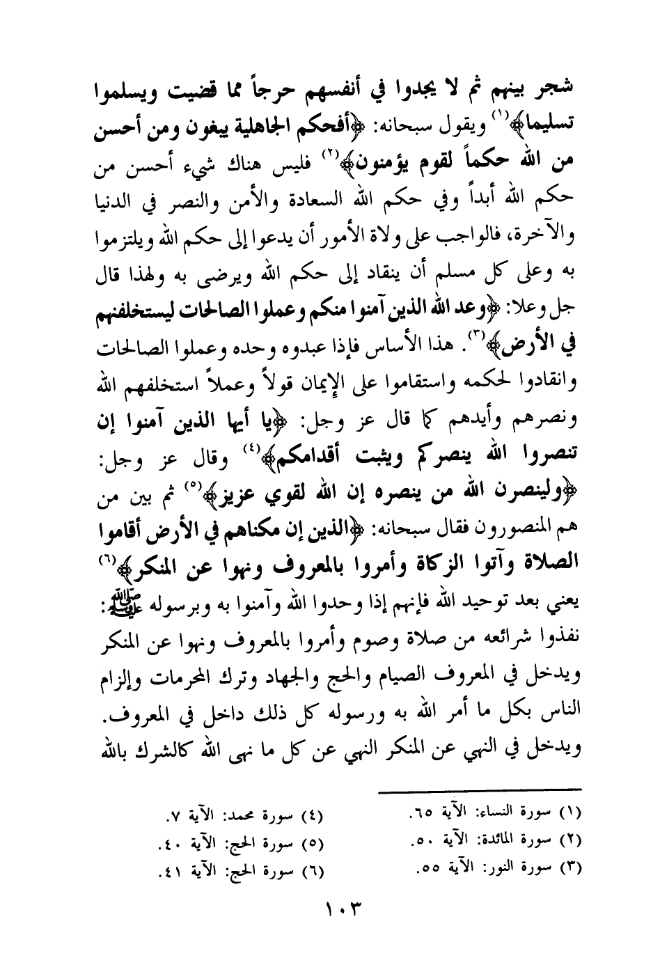 ويقول سبحانه: {أَفَحُكْمَ الْجَاهِلِيَّةِ يَبْغُونَ وَمَنْ أَحْسَنُ مِنَ اللَّهِ حُكْمًا لِقَوْمٍ يُوقِنُونَ} (¬1) فليس هناك شيء أحسن من حكم الله أبدا وفي حكم الله السعادة والأمن والنصر في الدنيا والآخرة، فالواجب على ولاة الأمور أن يدعوا إلى حكم الله ويلتزموا به وعلى كل مسلم أن ينقاد إلى حكم الله ويرضى به ولهذا قال جل وعلا: {وَعَدَ اللَّهُ الَّذِينَ آمَنُوا مِنْكُمْ وَعَمِلُوا الصَّالِحَاتِ لَيَسْتَخْلِفَنَّهُمْ فِي الْأَرْضِ} (¬2)