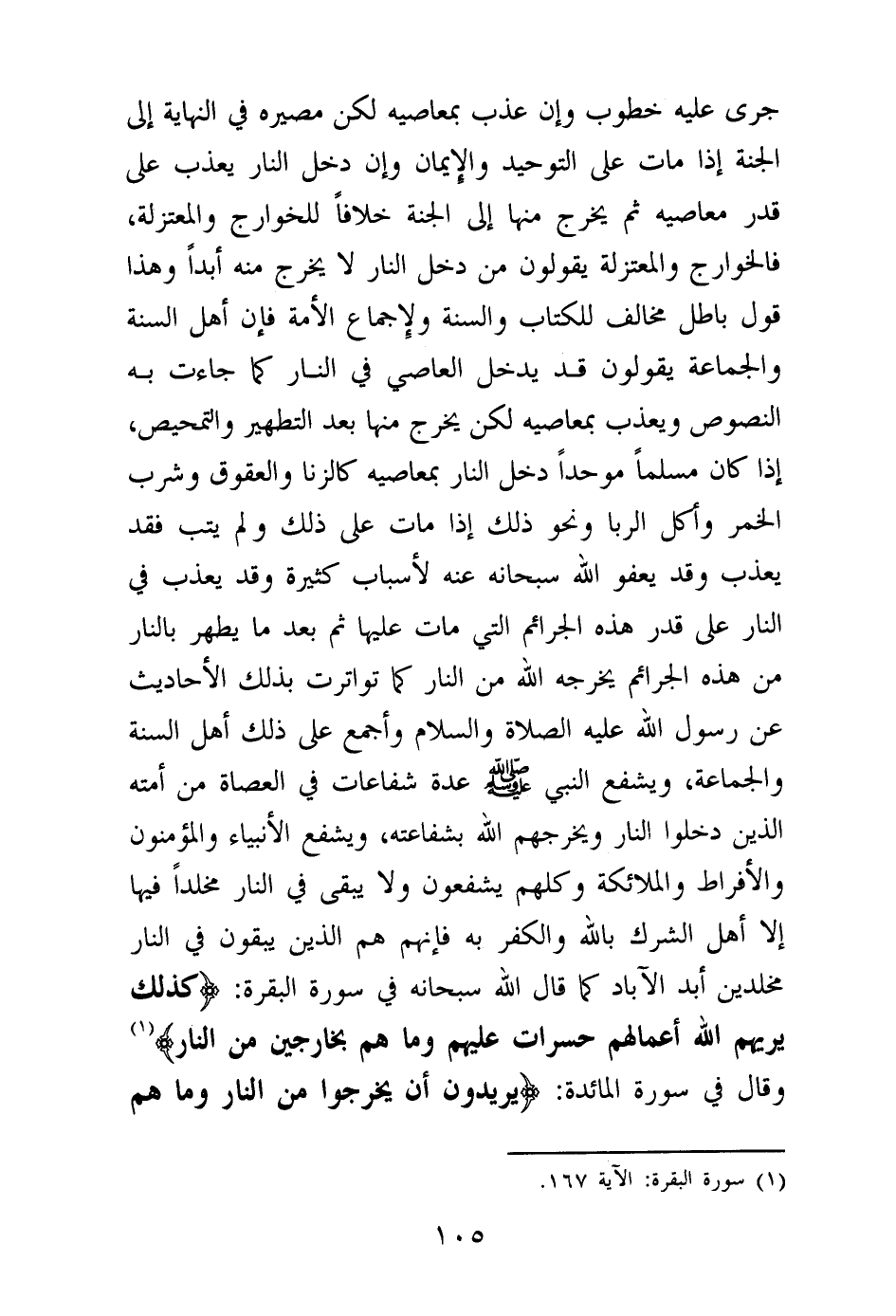 ويشفع النبي صلى الله عليه وسلم عدة شفاعات في العصاة من أمته الذين دخلوا النار ويخرجهم الله بشفاعته، ويشفع الأنبياء والمؤمنون والأفراط والملائكة وكلهم يشفعون ولا يبقى في النار مخلدا فيها إلا أهل الشرك بالله والكفر به فإنهم هم الذين يبقون في النار مخلدين أبد الآباد كما قال الله سبحانه في سورة البقرة: {كَذَلِكَ يُرِيهِمُ اللَّهُ أَعْمَالَهُمْ حَسَرَاتٍ عَلَيْهِمْ وَمَا هُمْ بِخَارِجِينَ مِنَ النَّارِ} (¬1) وقال في سورة المائدة: {يُرِيدُونَ أَنْ يَخْرُجُوا مِنَ النَّارِ وَمَا هُمْ بِخَارِجِينَ مِنْهَا وَلَهُمْ عَذَابٌ مُقِيمٌ} (¬2)