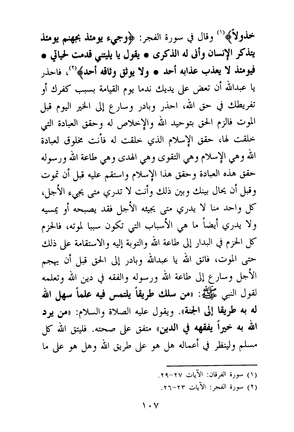 فاتق الله يا عبد الله وبادر إلى الحق قبل أن يهجم الأجل وسارع إلى طاعة الله ورسوله والفقه في دين الله وتعلمه لقول النبي صلى الله عليه وسلم: «من سلك طريقا يلتمس فيه علما سهل الله له به طريقا إلى الجنة (¬5) » ، ويقول عليه الصلاة والسلام: «من يرد الله به خيرا يفقهه في الدين (¬6) » متفق على صحته. فليتق الله كل مسلم ولينظر في أعماله هل هو على طريق الله وهل هو على ما