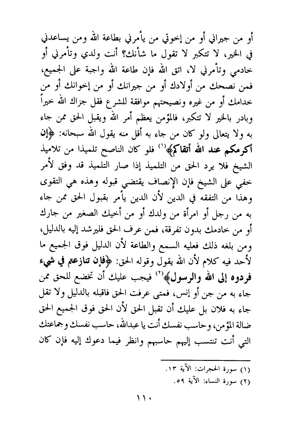 أو من جيراني أو من إخوتي من يأمرني بطاعة الله ومن يساعدني في الخير، لا تتكبر لا تقول: ما شأنك؟ أنت ولدي وتأمرني أو خادمي وتأمرني لا، اتق الله فإن طاعة الله واجبة على الجميع، فمن نصحك من أولادك أو من جيرانك أو من إخوانك أو من خدامك أو من غيره ونصيحتهم موافقة للشرع فقل: جزاك الله خيرا وبادر بالخير لا تتكبر، فالمؤمن يعظم أمر الله ويقبل الحق ممن جاء به ولا يتعالى ولو كان من جاء به أقل من يقول الله سبحانه: {إِنَّ أَكْرَمَكُمْ عِنْدَ اللَّهِ أَتْقَاكُمْ} (¬1) فلو كان الناصح تلميذ من تلاميذ الشيخ فلا يرد الحق من التلميذ إذا صار التلميذ قد وفق لأمر خفي على الشيخ فإن الإنصاف يقتضي قبوله وهذه هي التقوى وهذا من التفقه في الدين لأن الدين يأمر بقبول الحق ممن جاء به من رجل أو امرأة من ولدك أو من أخيك الصغير من جارك أو من خادمك بدون تفرقة، فمن عرف الحق فليرشد إليه بالدليل، ومن بلغه ذلك فعليه السمع والطاعة لأن الدليل فوق الجميع ما لأحد فيه كلام لأن الله يقول وقوله الحق: {فَإِنْ تَنَازَعْتُمْ فِي شَيْءٍ فَرُدُّوهُ إِلَى اللَّهِ وَالرَّسُولِ} (¬2)