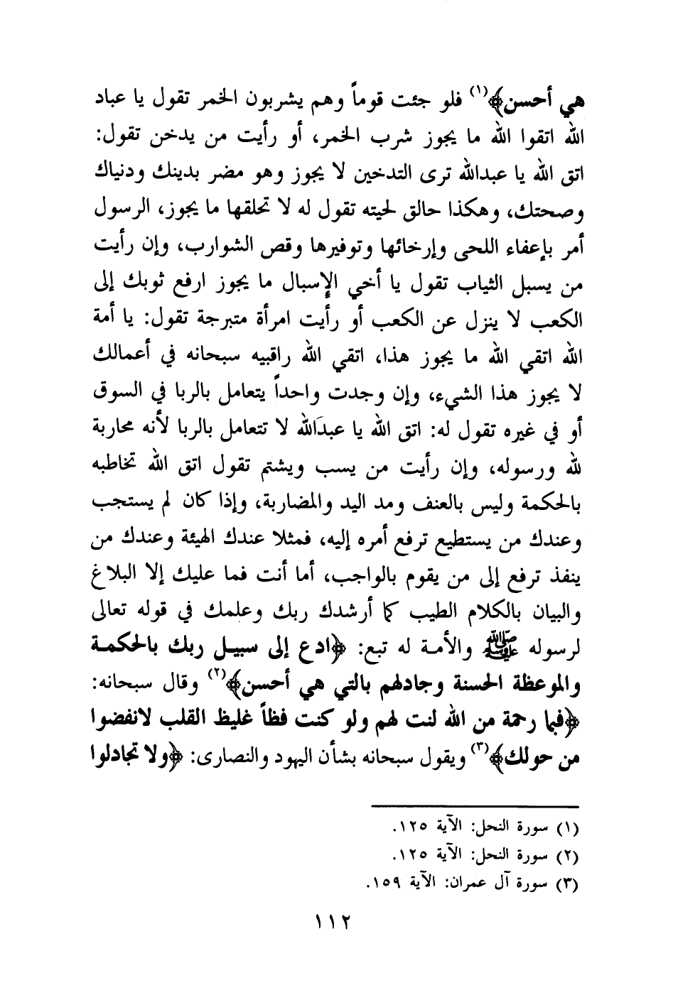 أما أنت فما عليك إلا البلاغ والبيان بالكلام الطيب كما أرشدك ربك وعلمك في قوله تعالى لرسوله صلى الله عليه وسلم والأمة له تبع: {ادْعُ إِلَى سَبِيلِ رَبِّكَ بِالْحِكْمَةِ وَالْمَوْعِظَةِ الْحَسَنَةِ وَجَادِلْهُمْ بِالَّتِي هِيَ أَحْسَنُ} (¬1) وقال سبحانه: {فَبِمَا رَحْمَةٍ مِنَ اللَّهِ لِنْتَ لَهُمْ وَلَوْ كُنْتَ فَظًّا غَلِيظَ الْقَلْبِ لَانْفَضُّوا مِنْ حَوْلِكَ} (¬2) ويقول سبحانه بشأن اليهود والنصارى: