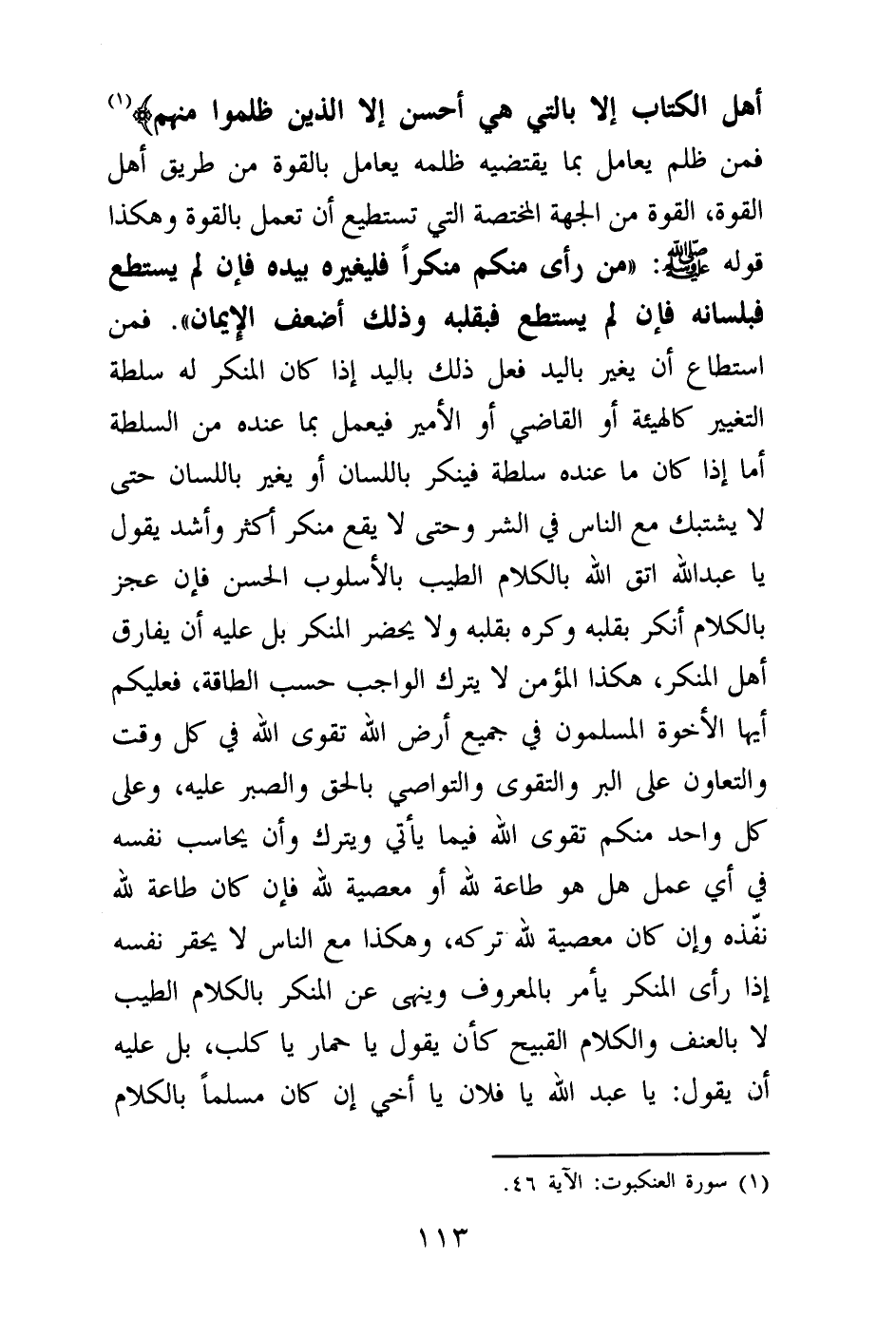 {وَلَا تُجَادِلُوا أَهْلَ الْكِتَابِ إِلَّا بِالَّتِي هِيَ أَحْسَنُ إِلَّا الَّذِينَ ظَلَمُوا مِنْهُمْ} (¬1) فمن ظلم يعامل بما يقتضيه ظلمه يعامل بالقوة من طريق أهل القوة، القوة من الجهة المختصة التي تستطيع أن تعمل بالقوة وهكذا قوله صلى الله عليه وسلم: «من رأى منكم منكرا فليغيره بيده فإن لم يستطع فبلسانه فإن لم يستطع فبقلبه وذلك أضعف الإيمان (¬2) » .