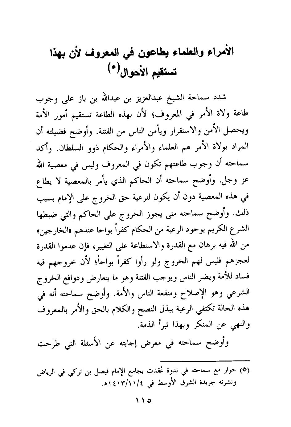 شدد سماحة الشيخ عبد العزيز بن عبد الله بن باز على وجوب طاعة ولاة الأمر في المعروف؛ لأن بهذه الطاعة تستقيم أمور الأمة ويحصل الأمن والاستقرار ويأمن الناس من الفتنة. وأوضح فضيلته أن المراد بولاة الأمر هم العلماء والأمراء والحكام ذوو السلطان.
