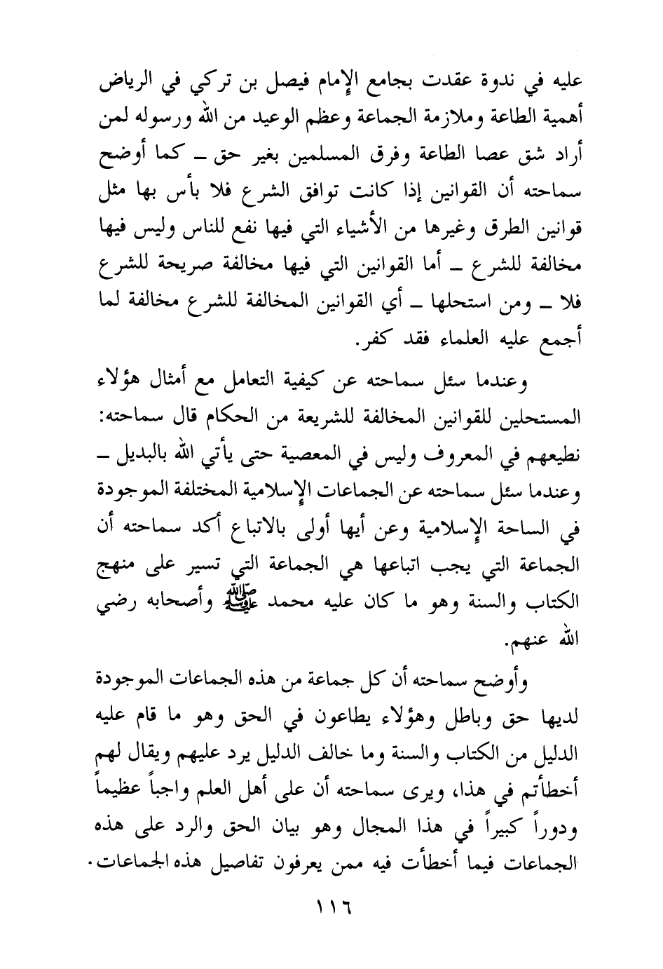 عليه في ندوة عقدت بجامع الإمام فيصل بن تركي في الرياض أهمية الطاعة وملازمة الجماعة وعظم الوعيد من الله ورسوله لمن أراد شق عصا الطاعة وفرق المسلمين بغير حق - كما أوضح سماحته أن القوانين إذا كانت توافق الشرع فلا بأس بها مثل قوانين الطرق وغيرها من الأشياء التي فيها نفع للناس وليس فيها مخالفة للشرع - أما القوانين التي فيها مخالفة صريحة للشرع فلا - ومن استحلها - أي القوانين المخالفة للشرع مخالفة لما أجمع عليه العلماء فقد كفر.