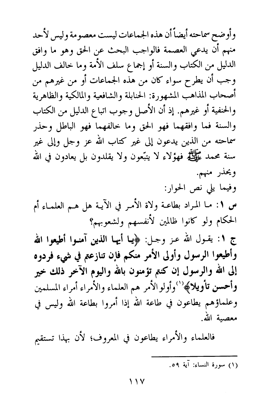 وأوضح سماحته أيضا أن هذه الجماعات ليست معصومة وليس لأحد منهم أن يدعي العصمة فالواجب البحث عن الحق وهو ما وافق الدليل من الكتاب والسنة أو إجماع سلف الأمة وما خالف الدليل وجب أن يطرح سواء كان من هذه الجماعات أو من غيرهم من أصحاب المذاهب المشهورة: الحنابلة والشافعية والمالكية والظاهرية والحنفية أو غيرهم. إذ إن الأصل وجوب اتباع الدليل من الكتاب والسنة فما وافقهما فهو الحق وما خالفهما فهو الباطل وحذر سماحته من الذين يدعون إلى غير كتاب الله عز وجل وإلى غير سنة محمد صلى الله عليه وسلم فهؤلاء لا يتبعون ولا يقلدون بل يعادون في الله ويحذر منهم. وفيما يلي نص الحوار: