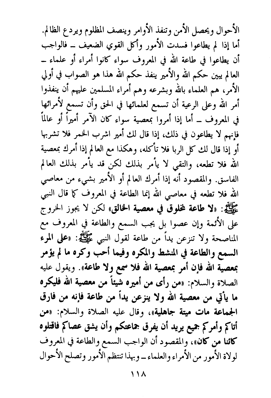 الأحوال ويحصل الأمن وتنفذ الأوامر وينصف المظلوم ويردع الظالم. أما إذا لم يطاعوا فسدت الأمور وأكل القوي الضعيف - فالواجب أن يطاعوا في طاعة الله في المعروف سواء كانوا أمراء أو علماء - العالم يبين حكم الله والأمير ينفذ حكم الله هذا هو الصواب في أولي الأمر، هم العلماء بالله وبشرعه وهم أمراء المسلمين عليهم أن ينفذوا أمر الله وعلى الرعية أن تسمع لعلمائها في الحق وأن تسمع لأمرائها في المعروف - أما إذا أمروا بمعصية سواء كان الآمر أميرا أو عالما فإنهم لا يطاعون في ذلك، إذا قال لك أمير: اشرب الخمر فلا تشربها أو إذا قال لك كل الربا فلا تأكله، وهكذا مع العالم إذا أمرك بمعصية الله فلا تطعه، والتقي لا يأمر بذلك لكن قد يأمر بذلك العالم الفاسق. والمقصود أنه إذا أمرك العالم أو الأمير بشيء من معاصي الله فلا تطعه في معاصي الله إنما الطاعة في المعروف كما قال النبي صلى الله عليه وسلم: «لا طاعة لمخلوق في معصية الخالق (¬1) » ، لكن لا يجوز الخروج على الأئمة وإن عصوا بل يجب السمع والطاعة في المعروف مع المناصحة ولا تنزعن يدا من طاعة لقول النبي صلى الله عليه وسلم: «على المرء السمع والطاعة في المنشط والمكره وفيما أحب وكره ما لم يؤمر بمعصية الله فإن أمر بمعصية الله فلا سمع ولا طاعة (¬2) » . ويقول عليه الصلاة والسلام: «من رأى من أميره شيئا من معصية الله فليكره ما يأتي من معصية الله ولا ينزعن يدا من طاعة فإنه من فارق الجماعة مات ميتة جاهلية (¬3) » ، وقال عليه الصلاة والسلام: «من أتاكم وأمركم جميع يريد أن يفرق جماعتكم وأن يشق عصاكم فاقتلوه كائنا من كان (¬4) » ، والمقصود أن الواجب السمع والطاعة في المعروف لولاة الأمور من الأمراء والعلماء - وبهذا تنتظم الأمور وتصلح الأحوال
