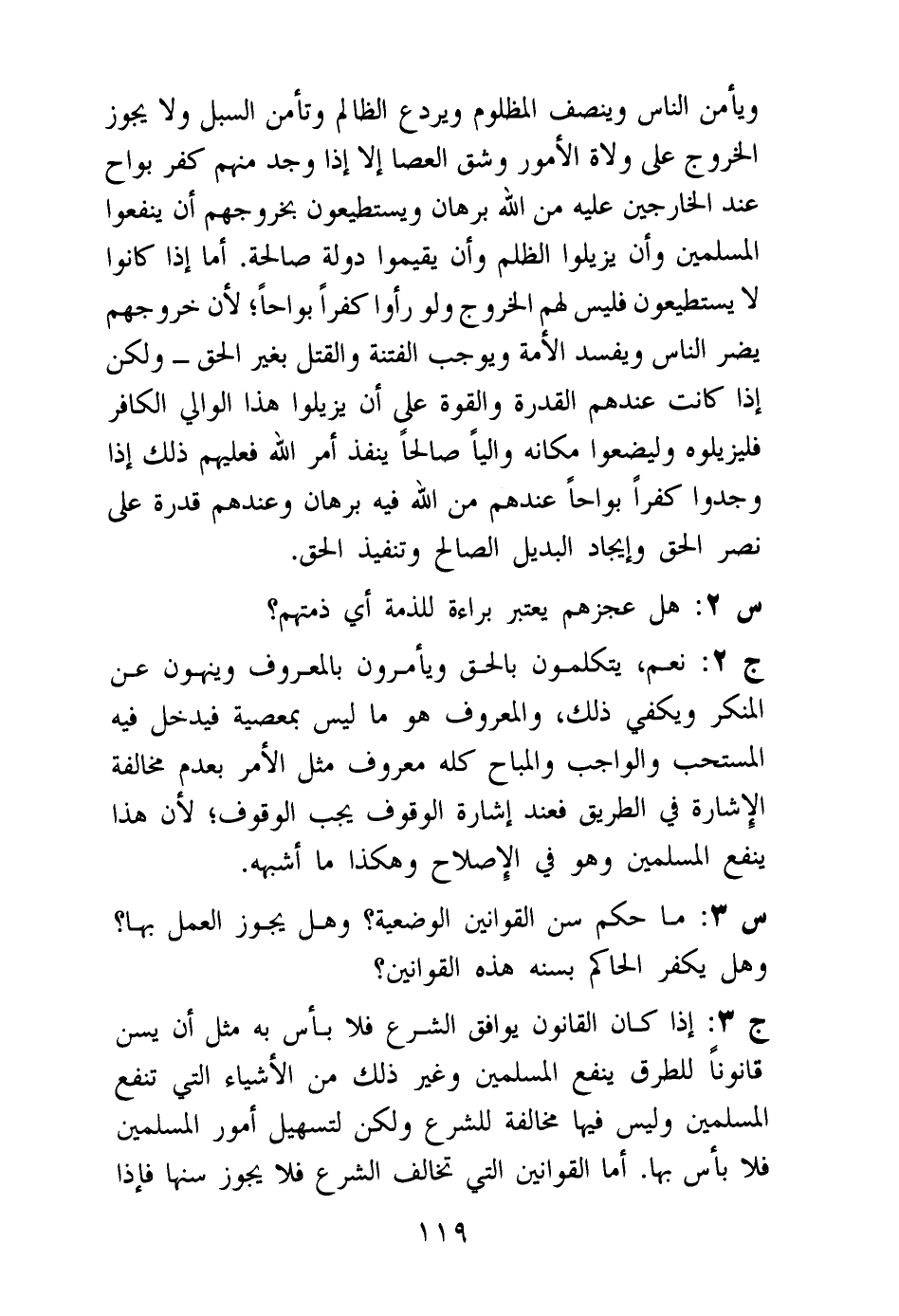 ويأمن الناس وينصف المظلوم ويردع الظالم وتأمن السبل ولا يجوز الخروج على ولاة الأمور وشق العصا إلا إذا وجد منهم كفر بواح عند الخارجين عليه من الله برهان ويستطيعون بخروجهم أن ينفعوا المسلمين وأن يزيلوا الظلم وأن يقيموا دولة صالحة. أما إذا كانوا لا يستطيعون فليس لهم الخروج ولو رأوا كفرا بواحا. لأن خروجهم يضر الناس ويفسد الأمة ويوجب الفتنة والقتل بغير الحق - ولكن إذا كانت عندهم القدرة والقوة على أن يزيلوا هذا الوالي الكافر فليزيلوه وليضعوا مكانه واليا صالحا ينفذ أمر الله فعليهم ذلك إذا وجدوا كفرا بواحا عندهم من الله فيه برهان وعندهم قدرة على نصر الحق وإيجاد البديل الصالح وتنفيذ الحق.