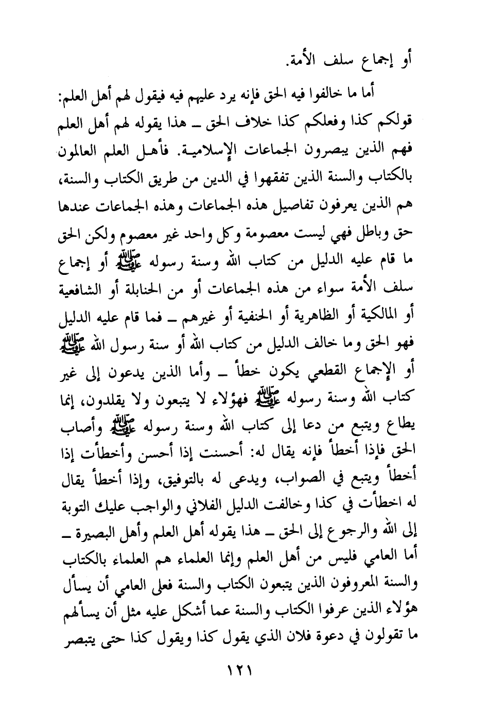 أما ما خالفوا فيه الحق فإنه يرد عليهم فيه فيقول لهم أهل العلم: قولكم كذا وفعلكم كذا خلاف الحق - هذا يقوله لهم أهل العلم فهم الذين يبصرون الجماعات الإسلامية. فأهل العلم العالمون بالكتاب والسنة الذين تفقهوا في الدين من طريق الكتاب والسنة، هم الذين يعرفون تفاصيل هذه الجماعات وهذه الجماعات عندها حق وباطل فهي ليست معصومة وكل واحد غير معصوم ولكن الحق ما قام عليه الدليل من كتاب الله وسنة رسوله صلى الله عليه وسلم أو إجماع سلف الأمة سواء من هذه الجماعات أو من الحنابلة أو الشافعية أو المالكية أو الظاهرية أو الحنفية أو غيرهم - فما قام عليه الدليل فهو الحق وما خالف الدليل من كتاب الله أو سنة رسول الله صلى الله عليه وسلم أو الإجماع القطعي يكون خطأ - وأما الذين يدعون إلى غير كتاب الله وسنة رسوله صلى الله عليه وسلم، فهؤلاء لا يتبعون ولا يقلدون، إنما يطاع ويتبع من دعا إلى كتاب الله وسنة رسوله صلى الله عليه وسلم وأصاب الحق فإذا أخطأ فإنه يقال له: أحسنت إذا أحسن وأخطأت إذا أخطأ ويتبع في الصواب، ويدعي له بالتوفيق، وإذا أخطأ يقال له: أخطأت في كذا وخالفت الدليل الفلاني والواجب عليك التوبة إلى الله والرجوع إلى الحق - هذا يقوله أهل العلم وأهل البصيرة - أما العامي فليس من أهل العلم وإنما العلماء هم العلماء بالكتاب والسنة المعروفون الذين يتبعون الكتاب والسنة فعلى العامي أن يسأل هؤلاء الذين عرفوا الكتاب والسنة عما أشكل عليه مثل أن يسألهم ما تقولون في دعوة فلان الذي يقول كذا ويقول كذا حتى يتبصر