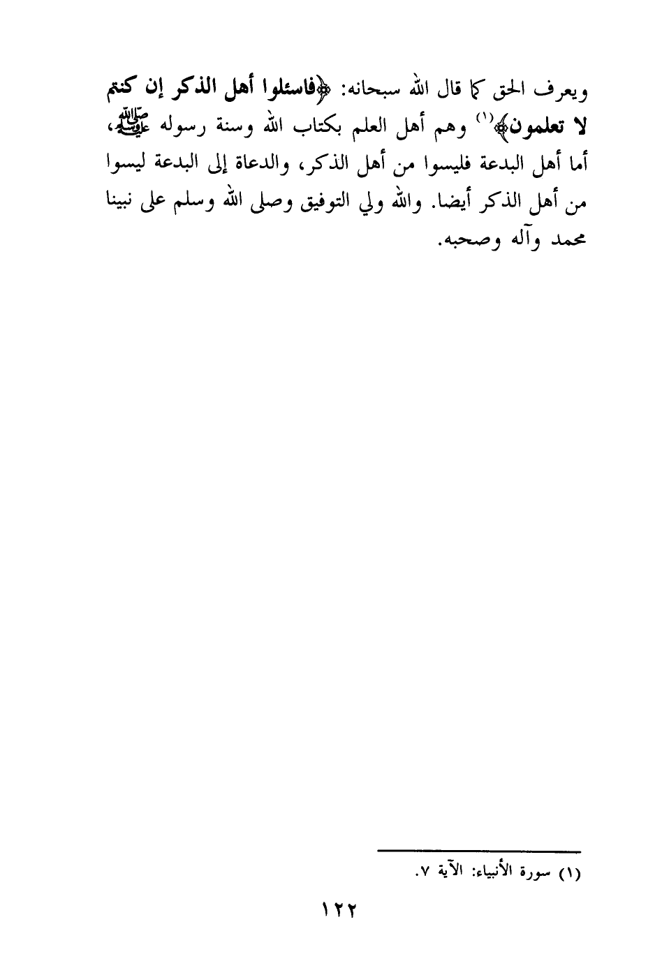 ويعرف الحق كما قال الله سبحانه: {فَاسْأَلُوا أَهْلَ الذِّكْرِ إِنْ كُنْتُمْ لَا تَعْلَمُونَ} (¬1) وهم أهل العلم بكتاب الله وسنة رسوله أما أهل البدعة فليسوا من أهل الذكر، والدعاة إلى البدعة ليسوا من أهل الذكر أيضا. والله ولي التوفيق وصلى الله وسلم على نبينا محمد وآله وصحبه.