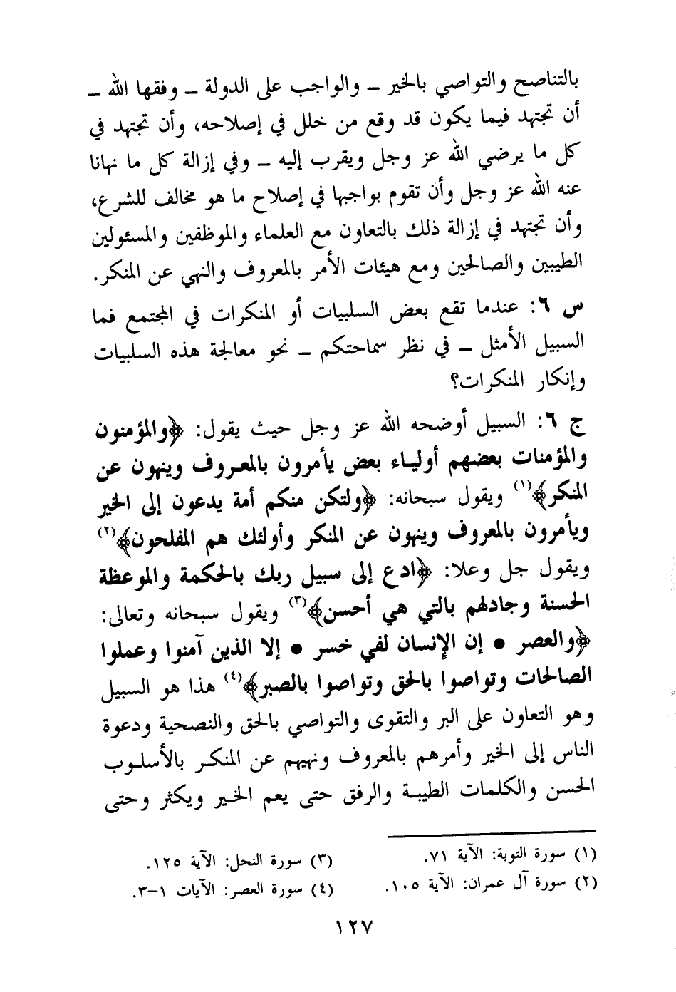 ج 6: السبيل أوضحه الله عز وجل حيث يقول: {وَالْمُؤْمِنُونَ وَالْمُؤْمِنَاتُ بَعْضُهُمْ أَوْلِيَاءُ بَعْضٍ يَأْمُرُونَ بِالْمَعْرُوفِ وَيَنْهَوْنَ عَنِ الْمُنْكَرِ} (¬1) ويقول سبحانه: {وَلْتَكُنْ مِنْكُمْ أُمَّةٌ يَدْعُونَ إِلَى الْخَيْرِ وَيَأْمُرُونَ بِالْمَعْرُوفِ وَيَنْهَوْنَ عَنِ الْمُنْكَرِ وَأُولَئِكَ هُمُ الْمُفْلِحُونَ} (¬2) ويقول جل وعلا: {ادْعُ إِلَى سَبِيلِ رَبِّكَ بِالْحِكْمَةِ وَالْمَوْعِظَةِ الْحَسَنَةِ وَجَادِلْهُمْ بِالَّتِي هِيَ أَحْسَنُ} (¬3) ويقول سبحانه وتعالى: {وَالْعَصْرِ} (¬4) {إِنَّ الْإِنْسَانَ لَفِي خُسْرٍ} (¬5) {إِلَّا الَّذِينَ آمَنُوا وَعَمِلُوا الصَّالِحَاتِ وَتَوَاصَوْا بِالْحَقِّ وَتَوَاصَوْا بِالصَّبْرِ} (¬6) وهذا هو السبيل وهو التعاون على البر والتقوى والتواصي بالحق والنصحية ودعوة الناس إلى الخير وأمرهم بالمعروف ونهيهم عن المنكر بالأسلوب الحسن والكلمات الطيبة والرفق حتى يعم الخير ويكثر وحتى