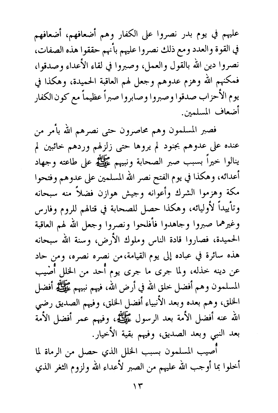 فصبر المسلمون وهم محاصرون حتى نصرهم الله بأمر من عنده على عدوهم بجنود لم يروها حتى زلزلهم وردهم خائبين لم ينالوا خيرا بسبب صبر الصحابة ونبيهم صلى الله عليه وسلم على طاعته وجهاد أعدائه، وهكذا في يوم الفتح نصر الله المسلمين على عدوهم وفتحوا مكة وهزموا الشرك وأعوانه وجيش هوازن فضلا منه سبحانه وتأييدا لأوليائه، وهكذا حصل للصحابة في قتالهم للروم وفارس وغيرهما صبروا وجاهدوا فأفلحوا ونصروا وجعل الله لهم العاقبة الحميدة، فصاروا قادة الناس وملوك الأرض، وسنة الله سبحانه هذه سائرة في عباده إلى يوم القيامة، من نصره نصره، ومن حاد عن دينه خذله، ولما جرى ما جرى يوم أحد من الخلل أصيب المسلمون وهم أفضل خلق الله في أرض الله، فيهم نبيهم صلى الله عليه وسلم أفضل الخلق، وهم بعده وبعد الأنبياء أفضل الخلق، وفيهم الصديق رضي الله عنه أفضل الأمة بعد الرسول صلى الله عليه وسلم، وفيهم عمر أفضل الأمة بعد النبي وبعد الصديق، وفيهم بقية الأخيار.
