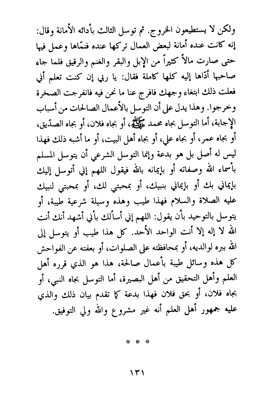 ولكن لا يستطيعون الخروج. ثم توسل الثالث بأدائه الأمانة وقال: إنه كانت عنده أمانة لبعض العمال تركها عنده فنماها وعمل فيها حتى صارت مالا كثيرا من الإبل والبقر والغنم والرقيق فلما جاء صاحبها أداها إليه كلها كاملة فقال: يا ربي إن كنت تعلم أني فعلت ذلك ابتغاء وجهك فافرج عنا ما نحن فيه فانفرجت الصخرة وخرجوا. وهذا يدل على أن التوسل بالأعمال الصالحات من أسباب الإجابة، أما التوسل بجاه محمد صلى الله عليه وسلم، أو بجاه فلان، أو بجاه الصديق، أو بجاه عمر، أو بجاه علي، أو بجاه أهل البيت، أو ما أشبه ذلك فهذا ليس له أصل بل هو بدعة وإنما التوسل الشرعي أن يتوسل المسلم بأسماء الله وصفاته أو بإيمانه بالله فيقول: اللهم إني أتوسل إليك بإيماني بك أو بإيماني بنبيك، أو بمحبتي لك، أو بمحبتي لنبيك عليه الصلاة والسلام فهذا طيب وهذه وسيلة شرعية طيبة، أو يتوسل بالتوحيد بأن يقول: اللهم إني أسألك بأني أشهد أنك أنت الله لا إله إلا أنت الواحد الأحد. كل هذا طيب أو يتوسل إلى الله ببره لوالديه، أو بمحافظته على الصلوات، أو بعفته عن الفواحش كل هذه وسائل طيبة بأعمال صالحة، هذا هو الذي قرره أهل العلم وأهل التحقيق من أهل البصرة، أما التوسل بجاه النبي، أو بجاه فلان، أو بحق فلان فهذا بدعة؟ تقدم بيان ذلك والذي عليه جمهور أهل العلم أنه غير مشروع والله ولي التوفيق.