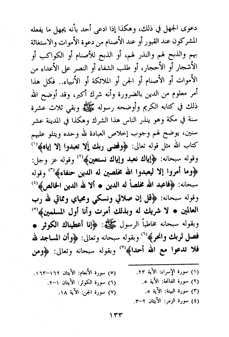دعوى الجهل في ذلك، وهكذا إذا ادعى أحد بأنه يجهل ما يفعله المشركون عند القبور أو عند الأصنام من دعوة الأموات والاستغاثة بهم والذبح لهم والنذر لهم، أو الذبح للأصنام أو الكواكب أو الأشجار أو الأحجار، أو طلب الشفاء أو النصر على الأعداء من الأموات أو الأصنام أو الجن أو الملائكة أو الأنبياء. . فكل هذا أمر معلوم من الدين بالضرورة وأنه شرك كبير، وقد أوضح الله ذلك في كتابه الكريم وأوضحه رسوله صلى الله عليه وسلم وبقي ثلاث عشرة سنة في مكة وهو ينذر الناس هذا الشرك وهكذا في المدينة عشر سنين، يوضح لهم وجوب إخلاص العبادة لله وحده ويتلو عليهم كتاب الله مثل قوله تعالى: {وَقَضَى رَبُّكَ أَلَّا تَعْبُدُوا إِلَّا إِيَّاهُ} (¬1) وقوله سبحانه: {إِيَّاكَ نَعْبُدُ وَإِيَّاكَ نَسْتَعِينُ} (¬2) وقوله عز وجل: {وَمَا أُمِرُوا إِلَّا لِيَعْبُدُوا اللَّهَ مُخْلِصِينَ لَهُ الدِّينَ حُنَفَاءَ} (¬3) وقوله سبحانه: {فَاعْبُدِ اللَّهَ مُخْلِصًا لَهُ الدِّينَ} (¬4) {أَلَا لِلَّهِ الدِّينُ الْخَالِصُ} (¬5) وقوله سبحانه: {قُلْ إِنَّ صَلَاتِي وَنُسُكِي وَمَحْيَايَ وَمَمَاتِي لِلَّهِ رَبِّ الْعَالَمِينَ} (¬6) {لَا شَرِيكَ لَهُ وَبِذَلِكَ أُمِرْتُ وَأَنَا أَوَّلُ الْمُسْلِمِينَ} (¬7) وبقوله سبحانه مخاطبا الرسول صلى الله عليه وسلم: {إِنَّا أَعْطَيْنَاكَ الْكَوْثَرَ} (¬8) {فَصَلِّ لِرَبِّكَ وَانْحَرْ} (¬9) وبقوله سبحانه وتعالى: {وَأَنَّ الْمَسَاجِدَ لِلَّهِ فَلَا تَدْعُوا مَعَ اللَّهِ أَحَدًا} (¬10) وبقوله سبحانه وتعالى: