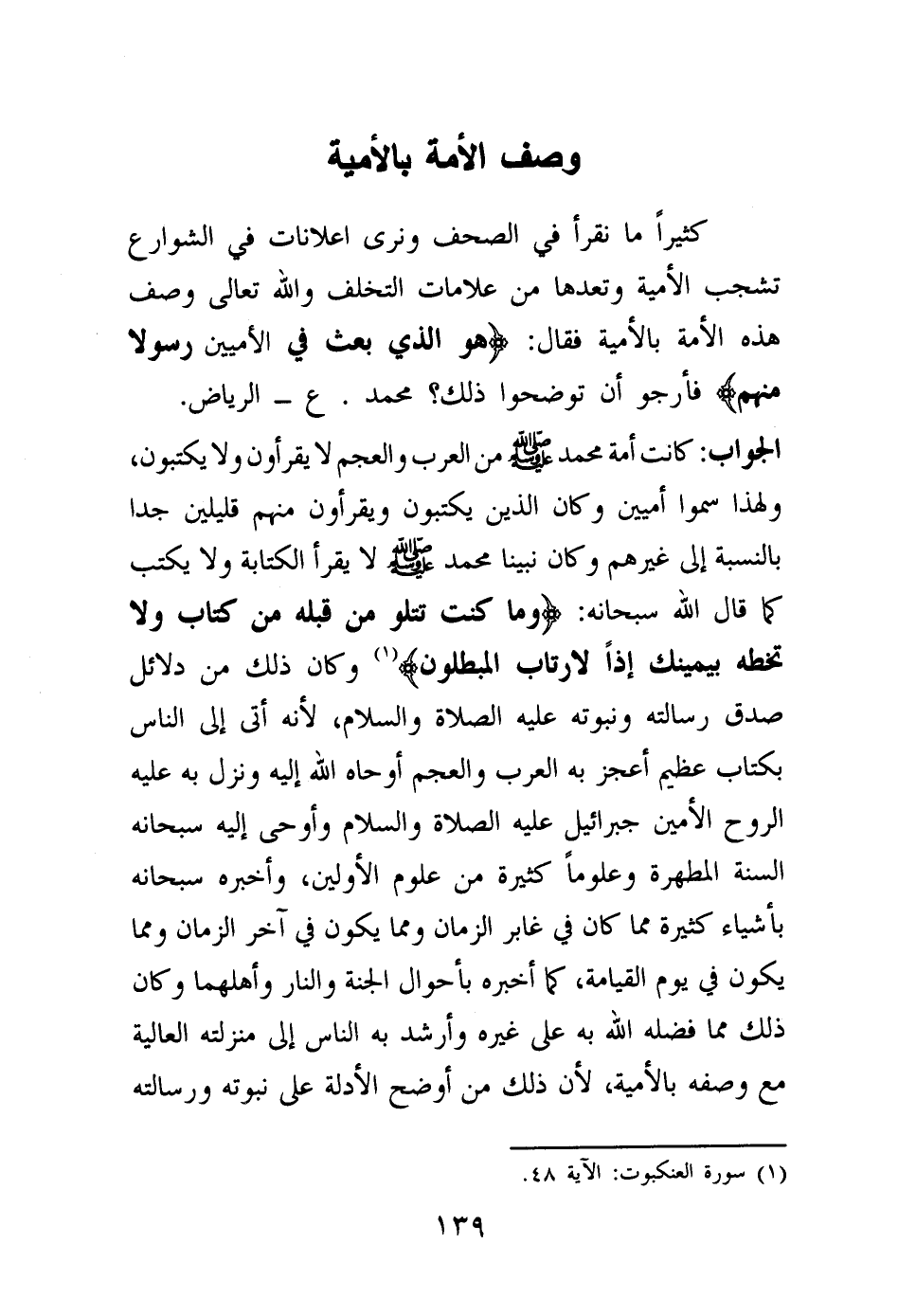 الجواب: كانت أمة محمد صلى الله عليه وسلم من العرب والعجم لا يقرءون ولا يكتبون، ولهذا سموا أميين وكان الذين يكتبون ويقرأون منهم قليلين جدا بالنسبة إلى غيرهم وكان نبينا محمد لا يقرأ الكتابة ولا يكتب كما قال الله سبحانه: {وَمَا كُنْتَ تَتْلُو مِنْ قَبْلِهِ مِنْ كِتَابٍ وَلَا تَخُطُّهُ بِيَمِينِكَ إِذًا لَارْتَابَ الْمُبْطِلُونَ} (¬2) وكان ذلك من دلائل صدق رسالته ونبوته عليه الصلاة والسلام، لأنه أتى إلى الناس بكتاب عظيم أعجز به العرب والعجم أوحاه الله إليه ونزل به عليه الروح الأمين جبرائيل عليه الصلاة والسلام وأوحى إليه سبحانه السنة المطهرة وعلوما كثيرة من علوم الأولين، وأخبره سبحانه بأشياء كثيرة مما كان في غابر الزمان ومما يكون في آخر الزمان ومما يكون في يوم القيامة، كما أخبره بأحوال الجنة والنار وأهلهما وكان ذلك مما فضله الله به على غيره وأرشد به الناس إلى منزلته العالية مع وصفه بالأمية، لأن ذلك من أوضح الأدلة على نبوته ورسالته