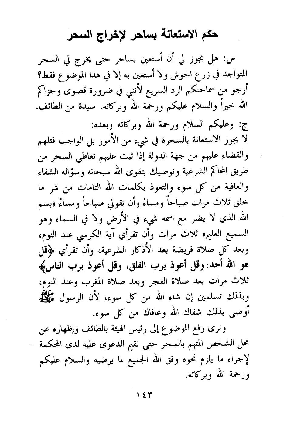 لا يجوز الاستعانة بالسحرة في شيء من الأمور بل الواجب قتلهم والقضاء عليهم من جهة الدولة إذا ثبت عليهم تعاطي السحر من طريق المحاكم الشرعية ونوصيك بتقوى الله سبحانه وسؤاله الشفاء والعافية من كل سوء والتعوذ بكلمات الله التامات من شر ما خلق ثلاث مرات صباحا ومساء وأن تقولي صباحا ومساء: بسم الله الذي لا يضر مع اسمه شيء في الأرض ولا في السماء وهو السميع العليم ثلاث مرات وأن تقرئي آية الكرسي عند النوم، وبعد كل صلاة فريضة بعد الأذكار الشرعية، وأن تقرئي: {قُلْ هُوَ اللَّهُ أَحَدٌ} (¬1) و {قُلْ أَعُوذُ بِرَبِّ الْفَلَقِ} (¬2) و {قُلْ أَعُوذُ بِرَبِّ النَّاسِ} (¬3) ثلاث مرات بعد صلاة الفجر وبعد صلاة المغرب وعند النوم، وبذلك تسلمين إن شاء الله من كل سوء، لأن الرسول صلى الله عليه وسلم أوصى بذلك شفاك الله وعافاك من كل سوء.