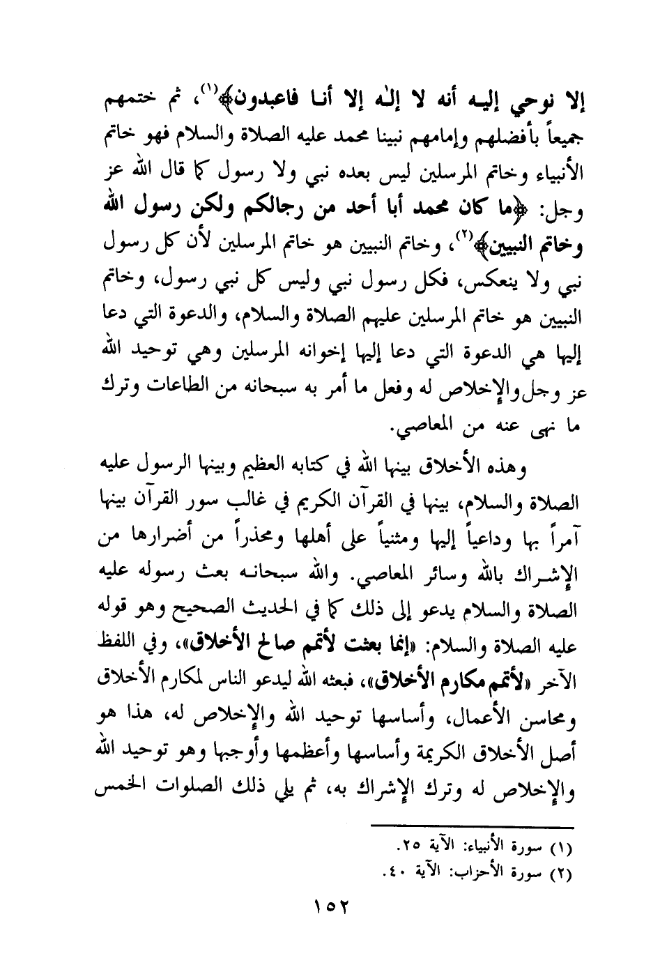 {وَمَا أَرْسَلْنَا مِنْ قَبْلِكَ مِنْ رَسُولٍ إِلَّا نُوحِي إِلَيْهِ أَنَّهُ لَا إِلَهَ إِلَّا أَنَا فَاعْبُدُونِ} (¬1) ثم ختمهم جميعا بأفضلهم وإمامهم نبينا محمد عليه الصلاة والسلام فهو خاتم الأنبياء وخاتم المرسلين ليس بعده نبي ولا رسول كما قال الله عز وجل: {مَا كَانَ مُحَمَّدٌ أَبَا أَحَدٍ مِنْ رِجَالِكُمْ وَلَكِنْ رَسُولَ اللَّهِ وَخَاتَمَ النَّبِيِّينَ} (¬2) وخاتم النبين هو خاتم المرسلين لأن كل رسول نبي ولا ينعكس، فكل رسول نبي وليس كل نبي رسولا، وخاتم النبيين هو خاتم المرسلين عليهم الصلاة والسلام، والدعوة التي دعا إليها هي الدعوة التي دعا إليها إخوانه المرسلين وهي توحيد الله عز جل والإخلاص له وفعل ما أمر به سبحانه من الطاعات وترك ما نهى عنه من المعاصي.