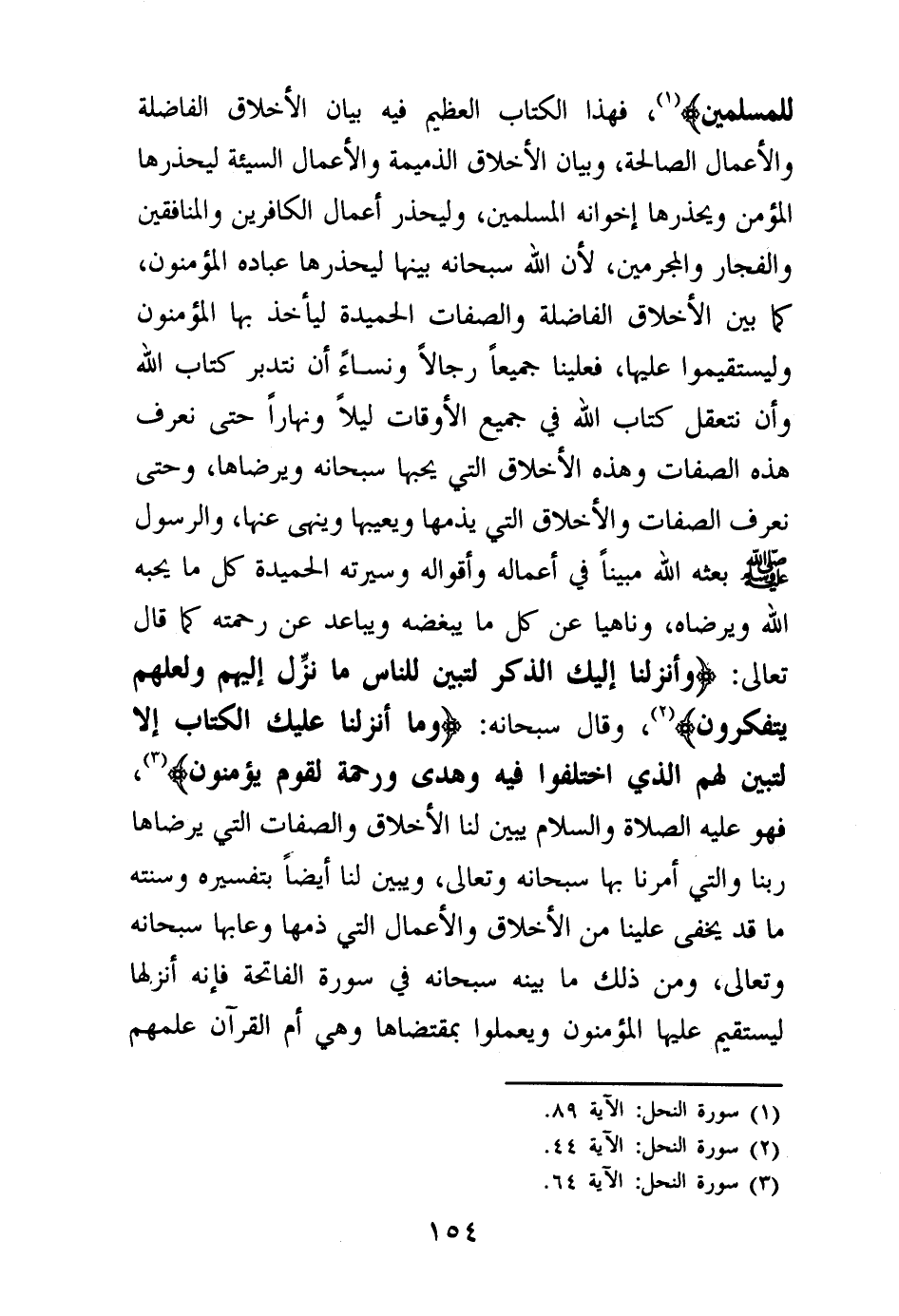 فعلينا جميعا رجالا ونساء أن نتدبر كتاب الله وأن نتعقل كتاب الله في جميع الأوقات ليلا ونهارا حتى نعرف هذه الصفات وهذه الأخلاق التي يحبها سبحانه ويرضاها، وحتى نعرف الصفات والأخلاق التي يذمها ويعيبها وينهى عنها، والرسول صلى الله عليه وسلم بعثه الله مبينا في أعماله وأقواله وسيرته الحميدة كل ما يحبه الله ويرضاه، وناهيا عن كل ما يبغضه ويباعد عن رحمته؟ قال تعالى: {وَأَنْزَلْنَا إِلَيْكَ الذِّكْرَ لِتُبَيِّنَ لِلنَّاسِ مَا نُزِّلَ إِلَيْهِمْ وَلَعَلَّهُمْ يَتَفَكَّرُونَ} (¬1) وقال سبحانه: {وَمَا أَنْزَلْنَا عَلَيْكَ الْكِتَابَ إِلَّا لِتُبَيِّنَ لَهُمُ الَّذِي اخْتَلَفُوا فِيهِ وَهُدًى وَرَحْمَةً لِقَوْمٍ يُؤْمِنُونَ} (¬2)