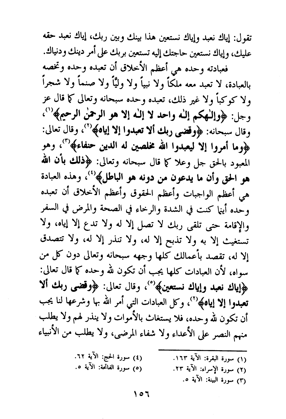 وهذه العبادة هي أعظم الواجبات وأعظم الحقوق وأعظم الأخلاق أن تعبده وحده أينما كنت في الشدة والرخاء في الصحة والمرض في السفر والإقامة حتى تلقى ربك لا تصل إلا له ولا تدع إلا إياه، ولا تستغث إلا به ولا تذبح إلا له، ولا تنذر إلا له، ولا تتصدق إلا له، تقصد بأعمالك كلها وجهه سبحانه وتعالى دون كل من سواه، لأن العبادات كلها يجب أن تكون لله وحده؟ قال تعالى: {إِيَّاكَ نَعْبُدُ وَإِيَّاكَ نَسْتَعِينُ} (¬5) وقال تعالى: {وَقَضَى رَبُّكَ أَلَّا تَعْبُدُوا إِلَّا إِيَّاهُ} (¬6) وكل العبادات التي أمر الله بها وشرعها لنا يجب أن تكون لله وحده، فلا يستغاث بالأموات ولا ينذر لهم ولا يطلب منهم النصر على الأعداء ولا شفاء المرضى، ولا يطلب من الأنبياء
