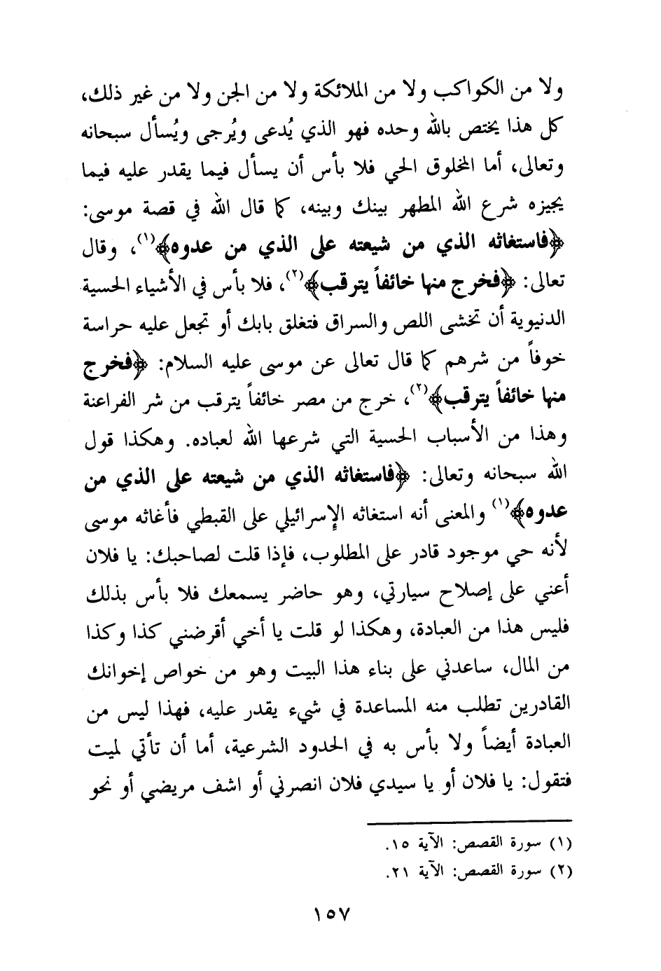 وهكذا قول الله سبحانه وتعالى: {فَاسْتَغَاثَهُ الَّذِي مِنْ شِيعَتِهِ عَلَى الَّذِي مِنْ عَدُوِّهِ} (¬4) والمعنى أنه استغاثه الإسرائيلي على القبطي فأغاثه موسى لأنه حي موجود قادر على المطلوب، فإذا قلت لصاحبك: يا فلان أعني على إصلاح سيارتي، وهو حاضر يسمعك فلا بأس بذلك فليس هذا من العبادة، وهكذا لو قلت يا أخي أقرضني كذا وكذا من المال، ساعدني على بناء هذا البيت وهو من خواص إخوانك القادرين تطلب منه المساعدة في شيء يقدر عليه فهذا ليس من العبادة أيضا ولا بأس به في الحدود الشرعية، أما أن تأتي لميت فتقول: يا فلان أو يا سيدي فلان انصرني أو اشف مريضي أو نحو
