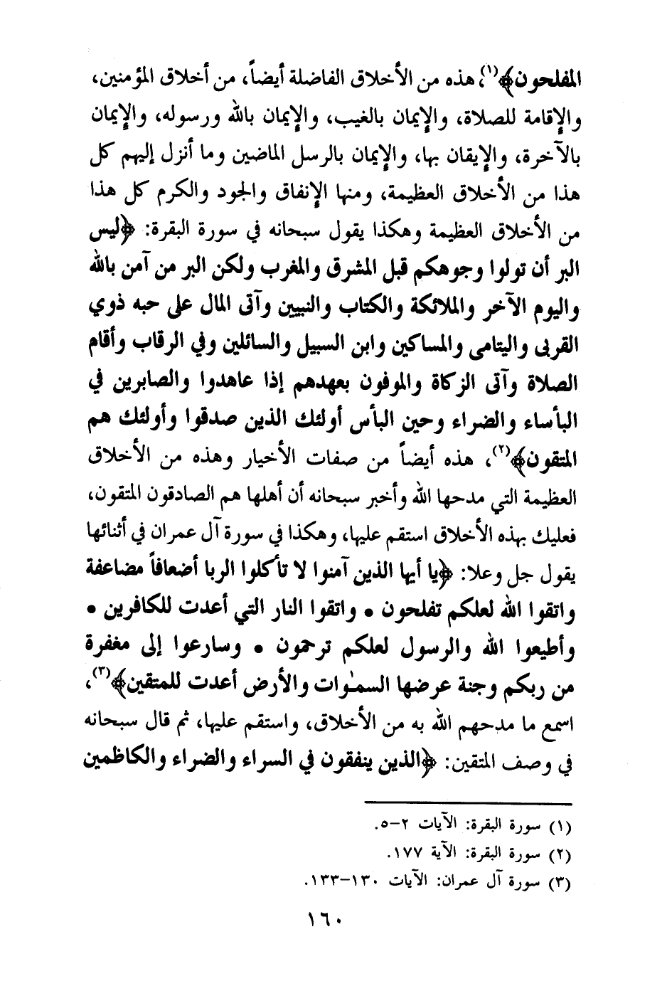 وهذه من الأخلاق العظيمة التي مدحها الله وأخبر سبحانه أن أهلها هم الصادقون المتقون، فعليك بهذه الأخلاق استقم عليها، وهكذا في سورة آل عمران في أثنائها يقول جل وعلا: {يَا أَيُّهَا الَّذِينَ آمَنُوا لَا تَأْكُلُوا الرِّبَا أَضْعَافًا مُضَاعَفَةً وَاتَّقُوا اللَّهَ لَعَلَّكُمْ تُفْلِحُونَ} (¬2) {وَاتَّقُوا النَّارَ الَّتِي أُعِدَّتْ لِلْكَافِرِينَ} (¬3) {وَأَطِيعُوا اللَّهَ وَالرَّسُولَ لَعَلَّكُمْ تُرْحَمُونَ} (¬4) {وَسَارِعُوا إِلَى مَغْفِرَةٍ مِنْ رَبِّكُمْ وَجَنَّةٍ عَرْضُهَا السَّمَاوَاتُ وَالْأَرْضُ أُعِدَّتْ لِلْمُتَّقِينَ} (¬5) اسمع ما مدحهم الله به من الأخلاق، واستقم عليها، ثم قال سبحانه في وصف المتقين: {الَّذِينَ يُنْفِقُونَ فِي السَّرَّاءِ وَالضَّرَّاءِ وَالْكَاظِمِينَ الْغَيْظَ وَالْعَافِينَ عَنِ النَّاسِ وَاللَّهُ يُحِبُّ الْمُحْسِنِينَ} (¬6)