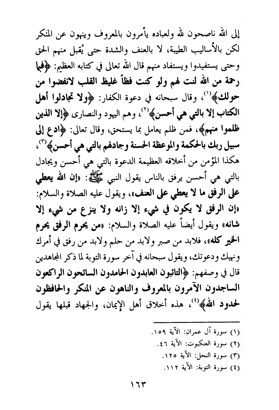 إلى الله ناصحون لله ولعباده يأمرون بالمعروف وينهون عن المنكر لكن بالأساليب الطيبة، لا بالعنف والشدة حتى يقبل منهم الحق وحتى يستفيدوا ويستفاد منهم قال الله تعالى في كتابه العظيم: {فَبِمَا رَحْمَةٍ مِنَ اللَّهِ لِنْتَ لَهُمْ وَلَوْ كُنْتَ فَظًّا غَلِيظَ الْقَلْبِ لَانْفَضُّوا مِنْ حَوْلِكَ} (¬1) وقال سبحانه في دعوة الكفار: {وَلَا تُجَادِلُوا أَهْلَ الْكِتَابِ إِلَّا بِالَّتِي هِيَ أَحْسَنُ} (¬2) وهم اليهود والنصارى {إِلَّا الَّذِينَ ظَلَمُوا مِنْهُمْ} (¬3) فمن ظلم يعامل بما يستحق، وقال تعالى: {ادْعُ إِلَى سَبِيلِ رَبِّكَ بِالْحِكْمَةِ وَالْمَوْعِظَةِ الْحَسَنَةِ وَجَادِلْهُمْ بِالَّتِي هِيَ أَحْسَنُ} (¬4) هكذا المؤمن من أخلاقه العظيمة الدعوة بالتي هي أحسن ويجادل بالتي هي أحسن يرفق بالناس يقول النبي: «إن الله يعطي على الرفق ما لا يعطي على العنف (¬5) » ، ويقول عليه الصلاة والسلام: «إن الرفق لا يكون في الشيء إلا زانه ولا ينزع من شيء إلا شانه (¬6) » ، ويقول أيضا عليه الصلاة والسلام: «من يحرم الرفق يحرم الخير كله (¬7) » ، فلا بد من صبر ولا بد من حلم ولا بد من رفق في أمرك ونهيك ودعوتك.