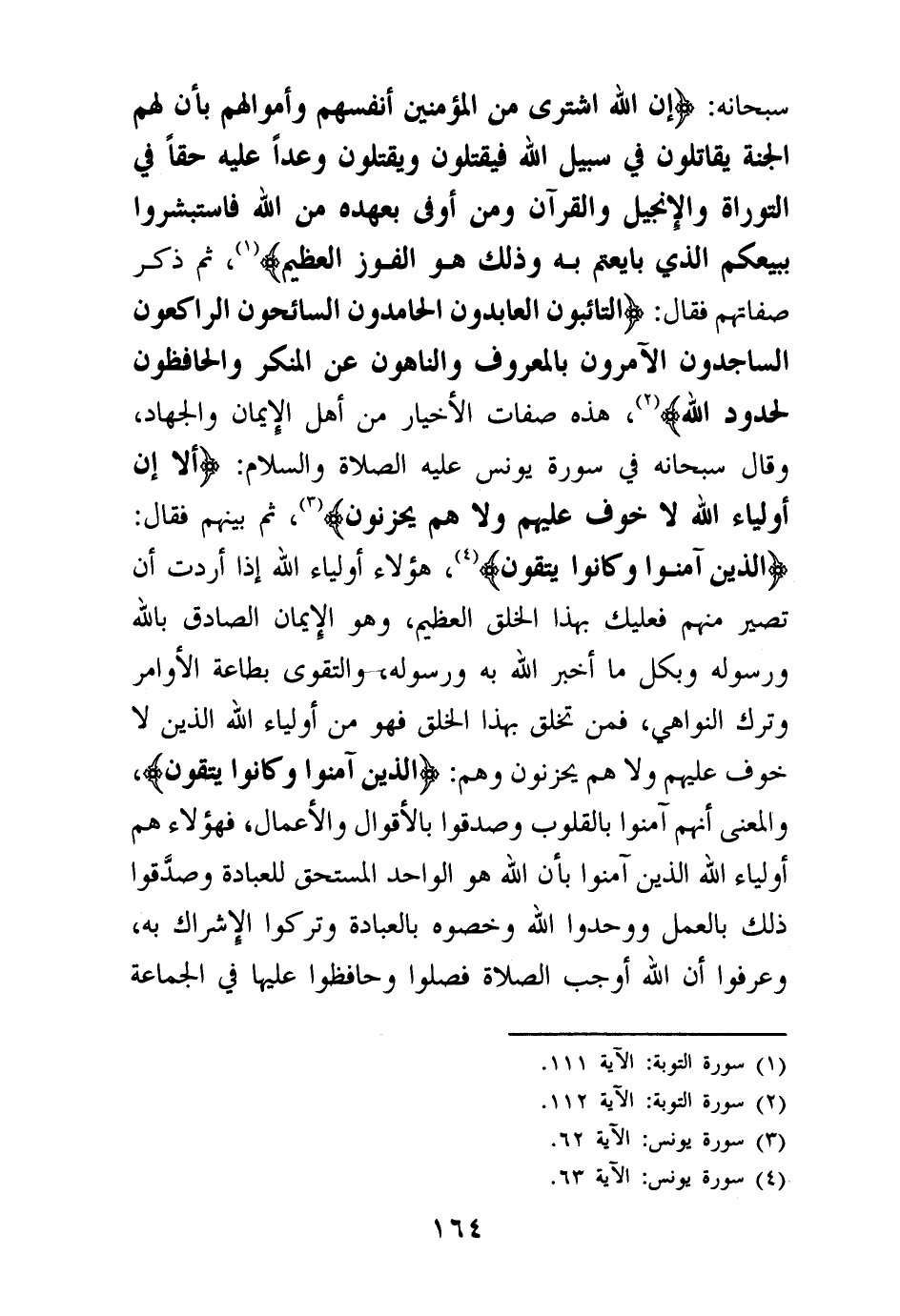 سبحانه: {إِنَّ اللَّهَ اشْتَرَى مِنَ الْمُؤْمِنِينَ أَنْفُسَهُمْ وَأَمْوَالَهُمْ بِأَنَّ لَهُمُ الْجَنَّةَ يُقَاتِلُونَ فِي سَبِيلِ اللَّهِ فَيَقْتُلُونَ وَيُقْتَلُونَ وَعْدًا عَلَيْهِ حَقًّا فِي التَّوْرَاةِ وَالْإِنْجِيلِ وَالْقُرْآنِ وَمَنْ أَوْفَى بِعَهْدِهِ مِنَ اللَّهِ فَاسْتَبْشِرُوا بِبَيْعِكُمُ الَّذِي بَايَعْتُمْ بِهِ وَذَلِكَ هُوَ الْفَوْزُ الْعَظِيمُ} (¬1) ثم ذكر صفاتهم فقال: {التَّائِبُونَ الْعَابِدُونَ الْحَامِدُونَ السَّائِحُونَ الرَّاكِعُونَ السَّاجِدُونَ الْآمِرُونَ بِالْمَعْرُوفِ وَالنَّاهُونَ عَنِ الْمُنْكَرِ وَالْحَافِظُونَ لِحُدُودِ اللَّهِ} (¬2) هذه صفات الأخيار من أهل الإيمان والجهاد، وقال سبحانه في سورة يونس عليه الصلاة والسلام: {أَلَا إِنَّ أَوْلِيَاءَ اللَّهِ لَا خَوْفٌ عَلَيْهِمْ وَلَا هُمْ يَحْزَنُونَ} (¬3) ثم بينهم فقال: {الَّذِينَ آمَنُوا وَكَانُوا يَتَّقُونَ} (¬4) هؤلاء أولياء الله إذا أردت أن تصير منهم فعليك بهذا الخلق العظيم، وهو الإيمان الصادق بالله ورسوله وبكل ما أخبر الله به ورسوله، والتقوى بطاعة الأوامر وترك النواهي، فمن تخلق بهذا الخلق فهو من أولياء الله الذين لا خوف عليهم ولا هم يحزنون وهم: {الَّذِينَ آمَنُوا وَكَانُوا يَتَّقُونَ} (¬5)