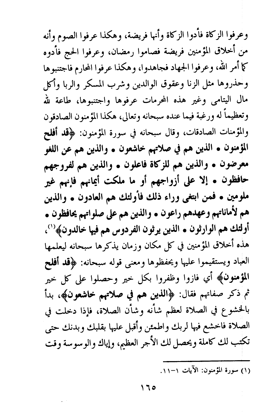 وقال سبحانه في سورة المؤمنون: {قَدْ أَفْلَحَ الْمُؤْمِنُونَ} (¬1) {الَّذِينَ هُمْ فِي صَلَاتِهِمْ خَاشِعُونَ} (¬2) {وَالَّذِينَ هُمْ عَنِ اللَّغْوِ مُعْرِضُونَ} (¬3) {وَالَّذِينَ هُمْ لِلزَّكَاةِ فَاعِلُونَ} (¬4) {وَالَّذِينَ هُمْ لِفُرُوجِهِمْ حَافِظُونَ} (¬5) {إِلَّا عَلَى أَزْوَاجِهِمْ أوْ مَا مَلَكَتْ أَيْمَانُهُمْ فَإِنَّهُمْ غَيْرُ مَلُومِينَ} (¬6) {فَمَنِ ابْتَغَى وَرَاءَ ذَلِكَ فَأُولَئِكَ هُمُ الْعَادُونَ} (¬7) {وَالَّذِينَ هُمْ لِأَمَانَاتِهِمْ وَعَهْدِهِمْ رَاعُونَ} (¬8) {وَالَّذِينَ هُمْ عَلَى صَلَوَاتِهِمْ يُحَافِظُونَ} (¬9) {أُولَئِكَ هُمُ الْوَارِثُونَ} (¬10) {الَّذِينَ يَرِثُونَ الْفِرْدَوْسَ هُمْ فِيهَا خَالِدُونَ} (¬11)