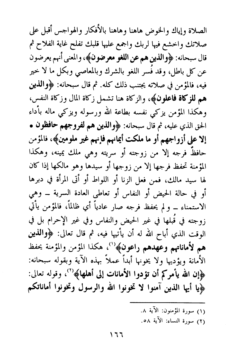 الصلاة وإياك والخوض هاهنا وهاهنا بالأفكار والهواجس أقبل على صلاتك واخشع فيها لربك واجمع عليها قلبك تفلح غاية الفلاح ثم قال سبحانه: {وَالَّذِينَ هُمْ عَنِ اللَّغْوِ مُعْرِضُونَ} (¬1) والمعنى أنهم يعرضون عن كل باطل، وقد فسر اللغو بالشرك وبالمعاصي وبكل ما لا خير فيه، فالمؤمن في صلاته يجتنب ذلك كله ثم قال سبحانه: {وَالَّذِينَ هُمْ لِلزَّكَاةِ فَاعِلُونَ} (¬2) والزكاة هنا تشمل زكاة المال وزكاة النفس، وهكذا المؤمن يزكي نفسه بطاعة الله ورسوله ويزكي ماله بأداء الحق الذي عليه، ثم قال سبحانه: {وَالَّذِينَ هُمْ لِفُرُوجِهِمْ حَافِظُونَ} (¬3) {إِلَّا عَلَى أَزْوَاجِهِمْ أوْ مَا مَلَكَتْ أَيْمَانُهُمْ فَإِنَّهُمْ غَيْرُ مَلُومِينَ} (¬4) فالمؤمن حافظ فرجه إلا من زوجته أو سريته وهي ملك يمينه، وهكذا المؤمنة تحفظ فرجها إلا من زوجها أو سيدها وهو مالكها إذا كان لها سيد مالك، فمن فعل الزنى أو اللواط أو أتى المرأة في دبرها أو في حالة الحيض أو النفاس أو تعاطى العادة السرية - وهي الاستمناء - ولم يحفظ فرجه صار عاديا أي ظالما، فالمؤمن يأتي زوجته في قبلها في غير الحيض والنفاس وفي غير الإحرام بل في الوقت الذي أباح الله له أن يأتيها فيه، ثم قال تعالى: {وَالَّذِينَ هُمْ لِأَمَانَاتِهِمْ وَعَهْدِهِمْ رَاعُونَ} (¬5) هكذا المؤمن والمؤمنة يحفظ الأمانة ويؤديها ولا يخونها أبدا عملا بهذه الآية وبقوله سبحانه: {إِنَّ اللَّهَ يَأْمُرُكُمْ أَنْ تُؤَدُّوا الْأَمَانَاتِ إِلَى أَهْلِهَا} (¬6) وقوله تعالى: {يَا أَيُّهَا الَّذِينَ آمَنُوا لَا تَخُونُوا اللَّهَ وَالرَّسُولَ وَتَخُونُوا أَمَانَاتِكُمْ وَأَنْتُمْ تَعْلَمُونَ} (¬7)