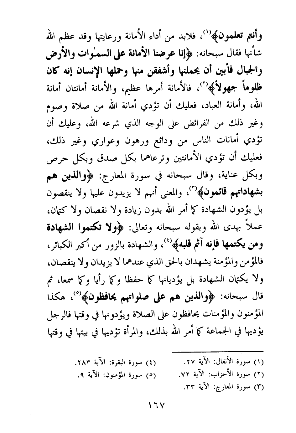 فلا بد من أداء الأمانة ورعايتها وقد عظم الله شأنها فقال سبحانه: {إِنَّا عَرَضْنَا الْأَمَانَةَ عَلَى السَّمَاوَاتِ وَالْأَرْضِ وَالْجِبَالِ فَأَبَيْنَ أَنْ يَحْمِلْنَهَا وَأَشْفَقْنَ مِنْهَا وَحَمَلَهَا الْإِنْسَانُ إِنَّهُ كَانَ ظَلُومًا جَهُولًا} (¬1) فالأمانة أمرها عظيم، والأمانة أمانتان أمانة الله، وأمانة العباد، فعليك أن تؤدي أمانة الله من صلاة وصوم وغير ذلك من الفرائض على الوجه الذي شرعه الله، وعليك أن تؤدي أمانات الناس من ودائع ورهون وعواري وغير ذلك، فعليك أن تؤدي الأمانتين وترعاهما بكل صدق وبكل حرص وبكل عناية.
