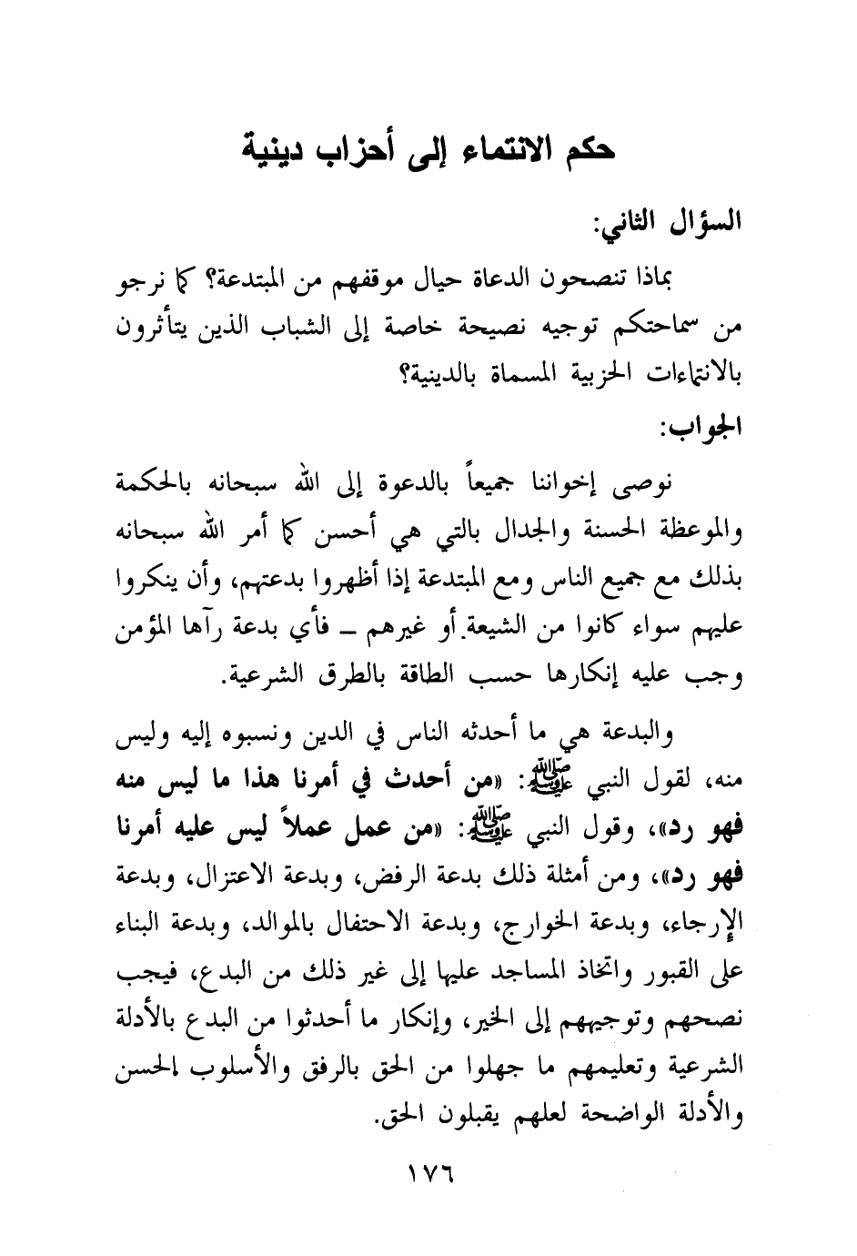والبدعة هي ما أحدثه الناس في الدين ونسبوه إليه وليس منه، لقول النبي: «من أحدث في أمرنا هذا ما ليس منه فهو رد (¬1) » ، وقول النبي صلى الله عليه وسلم: «من عمل عملا ليس عليه أمرنا فهو رد (¬2) » ، ومن أمثلة ذلك بدعة الرفض، وبدعة الاعتزال، وبدعة الإرجاء، وبدعة الخوارج، وبدعه الاحتفال بالموالد، وبدعة البناء على القبور واتخاذ المساجد عليها إلى غير ذلك من البدع، فيجب نصحهم وتوجيههم إلى الخير، وإنكار ما أحدثوا من البدع بالأدلة الشرعية وتعليمهم ما جهلوا من الحق بالرفق والأسلوب الحسن والأدلة الواضحة لعلهم يقبلون الحق.