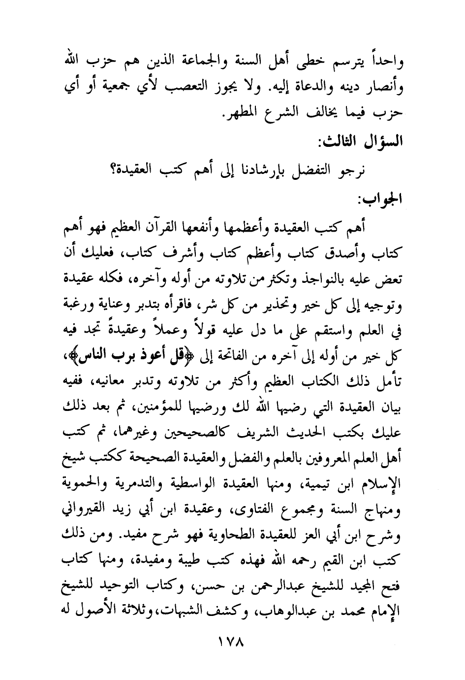 الجواب: أهم كتب العقيدة وأعظمها وأنفعها القرآن العظيم فهو أهم كتاب وأصدق كتاب وأعظم كتاب وأشرف كتاب، فعليك أن تعض عليه بالنواجذ وتكثر من تلاوته من أوله وآخره، فكله عقيدة وتوجيه إلى كل خير وتحذير من كل شر، فاقرأه بتدبر وعناية ورغبة في العلم واستقم على ما دل عليه قولا وعملا وعقيدة تجد فيه كل خير من أوله إلى آخره من الفاتحة إلى {قُلْ أَعُوذُ بِرَبِّ النَّاسِ} (¬1) تأمل ذلك الكتاب العظيم وأكثر من تلاوته وتدبر معانيه، ففيه بيان العقيدة التي رضيها الله لك ورضيها للمؤمنين.