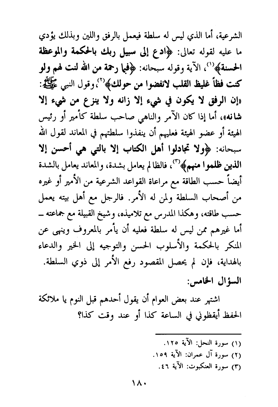 الشرعية، أما الذي ليس له سلطة فيعمل بالرفق واللين وبذلك يؤدي ما عليه لقوله تعالى: {ادْعُ إِلَى سَبِيلِ رَبِّكَ بِالْحِكْمَةِ وَالْمَوْعِظَةِ الْحَسَنَةِ} (¬1) الآية، وقوله سبحانه: {فَبِمَا رَحْمَةٍ مِنَ اللَّهِ لِنْتَ لَهُمْ وَلَوْ كُنْتَ فَظًّا غَلِيظَ الْقَلْبِ لَانْفَضُّوا مِنْ حَوْلِكَ} (¬2) وقول النبي صلى الله عليه وسلم: «إن الرفق لا يكون في شيء إلا زانه ولا ينزع من شيء إلا شانه (¬3) » .