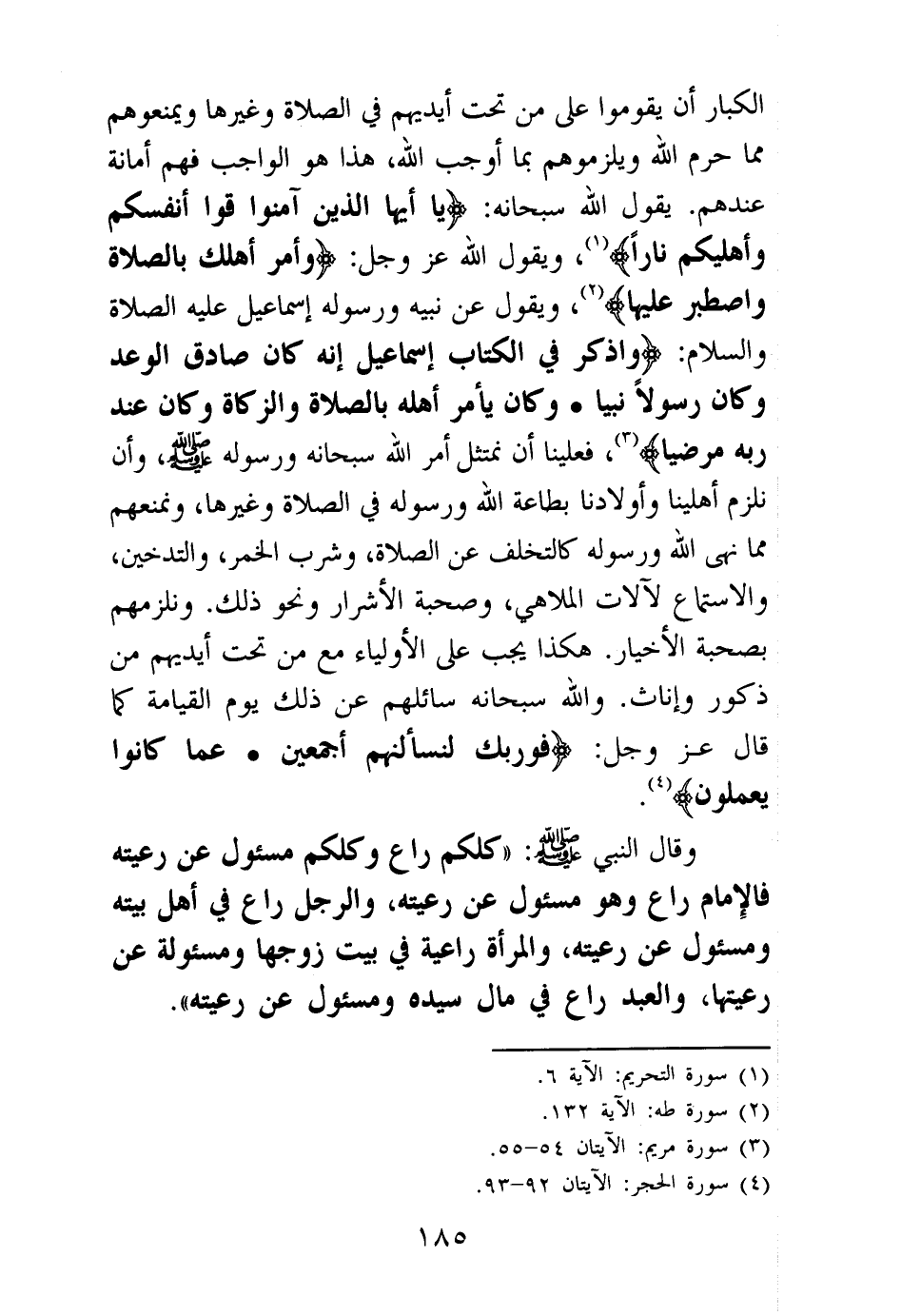 وقال النبي صلى الله عليه وسلم: «كلكم راع وكلكم مسئول عن رعيته فالإمام راع وهو مسئول عن رعيته والرجل راع في أهل بيته ومسئول عن رعيته والمرأة راعية في بيت زوجها ومسئولة عن رعيتها والعبد راع في مال سيده ومسئول عن رعيته (¬7) » .