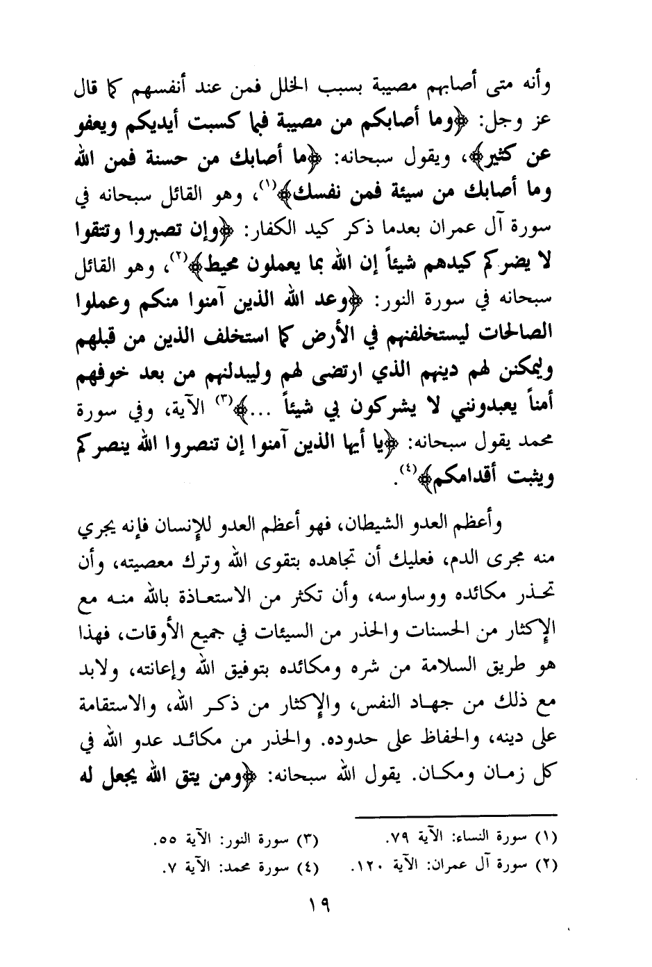 وأنه متى أصابهم مصيبة بسبب الخلل فمن عند أنفسهم كما قال عز وجل: {وَمَا أَصَابَكُمْ مِنْ مُصِيبَةٍ فَبِمَا كَسَبَتْ أَيْدِيكُمْ وَيَعْفُو عَنْ كَثِيرٍ} (¬1) ويقول سبحانه: {مَا أَصَابَكَ مِنْ حَسَنَةٍ فَمِنَ اللَّهِ وَمَا أَصَابَكَ مِنْ سَيِّئَةٍ فَمِنْ نَفْسِكَ} (¬2) وهو القائل سبحانه في سورة آل عمران بعد ما ذكر كيد الكفار: {وَإِنْ تَصْبِرُوا وَتَتَّقُوا لَا يَضُرُّكُمْ كَيْدُهُمْ شَيْئًا إِنَّ اللَّهَ بِمَا يَعْمَلُونَ مُحِيطٌ} (¬3) وهو القائل سبحانه في سورة النور: {وَعَدَ اللَّهُ الَّذِينَ آمَنُوا مِنْكُمْ وَعَمِلُوا الصَّالِحَاتِ لَيَسْتَخْلِفَنَّهُمْ فِي الْأَرْضِ كَمَا اسْتَخْلَفَ الَّذِينَ مِنْ قَبْلِهِمْ وَلَيُمَكِّنَنَّ لَهُمْ دِينَهُمُ الَّذِي ارْتَضَى لَهُمْ وَلَيُبَدِّلَنَّهُمْ مِنْ بَعْدِ خَوْفِهِمْ أَمْنًا يَعْبُدُونَنِي لَا يُشْرِكُونَ بِي شَيْئًا} (¬4) الآية، وفي سورة محمد يقول سبحانه: {يَا أَيُّهَا الَّذِينَ آمَنُوا إِنْ تَنْصُرُوا اللَّهَ يَنْصُرْكُمْ وَيُثَبِّتْ أَقْدَامَكُمْ} (¬5) وأعظم العدو الشيطان، فهو أعظم العدو للإنسان فإنه يجري منه مجرى الدم، فعليك أن تجاهده بتقوى الله وترك معصيته، وأن تحذر مكائده ووساوسه، وأن تكثر من الاستعاذة بالله منه مع الإكثار من الحسنات والحذر من السيئات في جميع الأوقات، فهذا هو طريق السلامة من شره ومكائده بتوفيق الله وإعانته.