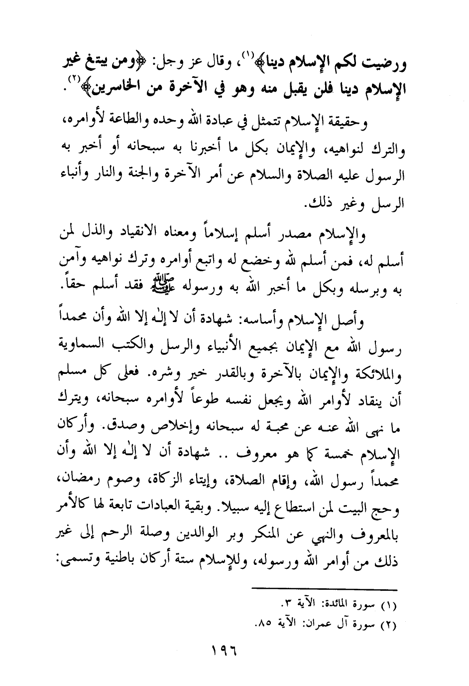 وأصل الإسلام وأساسه: شهادة أن لا إله إلا الله وأن محمدا رسول الله مع الإيمان بجميع الأنبياء والرسل والكتب السماوية والملائكة والإيمان بالآخرة وبالقدر خير وشره. فعلى كل مسلم أن ينقاد لأوامر الله ويجعل نفسه طوعا لأوامره سبحانه، ويترك ما نهى الله عنه عن محبة له سبحانه وإخلاص وصدق.