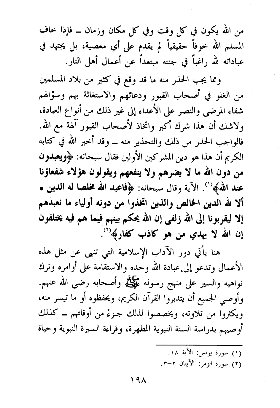 ومما يجب الحذر منه ما قد وقع في كثير من بلاد المسلمين من الغلو في أصحاب القبور ودعائهم والاستغاثة بهم وسؤالهم شفاء المرضى والنصر على الأعداء إلى غير ذلك من أنواع العبادة، ولا شك أن هذا شرك كبر واتخاذ لأصحاب القبور آلهة مع الله. فالواجب الحذر من ذلك والتحذير منه - وقد أخبر الله في كتابه الكريم أن هذا هو دين المشركين الأولين فقال سبحانه: {وَيَعْبُدُونَ مِنْ دُونِ اللَّهِ مَا لَا يَضُرُّهُمْ وَلَا يَنْفَعُهُمْ وَيَقُولُونَ هَؤُلَاءِ شُفَعَاؤُنَا عِنْدَ اللَّهِ} (¬1) الآية، وقال سبحانه: {فَاعْبُدِ اللَّهَ مُخْلِصًا لَهُ الدِّينَ} (¬2) {أَلَا لِلَّهِ الدِّينُ الْخَالِصُ وَالَّذِينَ اتَّخَذُوا مِنْ دُونِهِ أَوْلِيَاءَ مَا نَعْبُدُهُمْ إِلَّا لِيُقَرِّبُونَا إِلَى اللَّهِ زُلْفَى إِنَّ اللَّهَ يَحْكُمُ بَيْنَهُمْ فِي مَا هُمْ فِيهِ يَخْتَلِفُونَ إِنَّ اللَّهَ لَا يَهْدِي مَنْ هُوَ كَاذِبٌ كَفَّارٌ} (¬3)