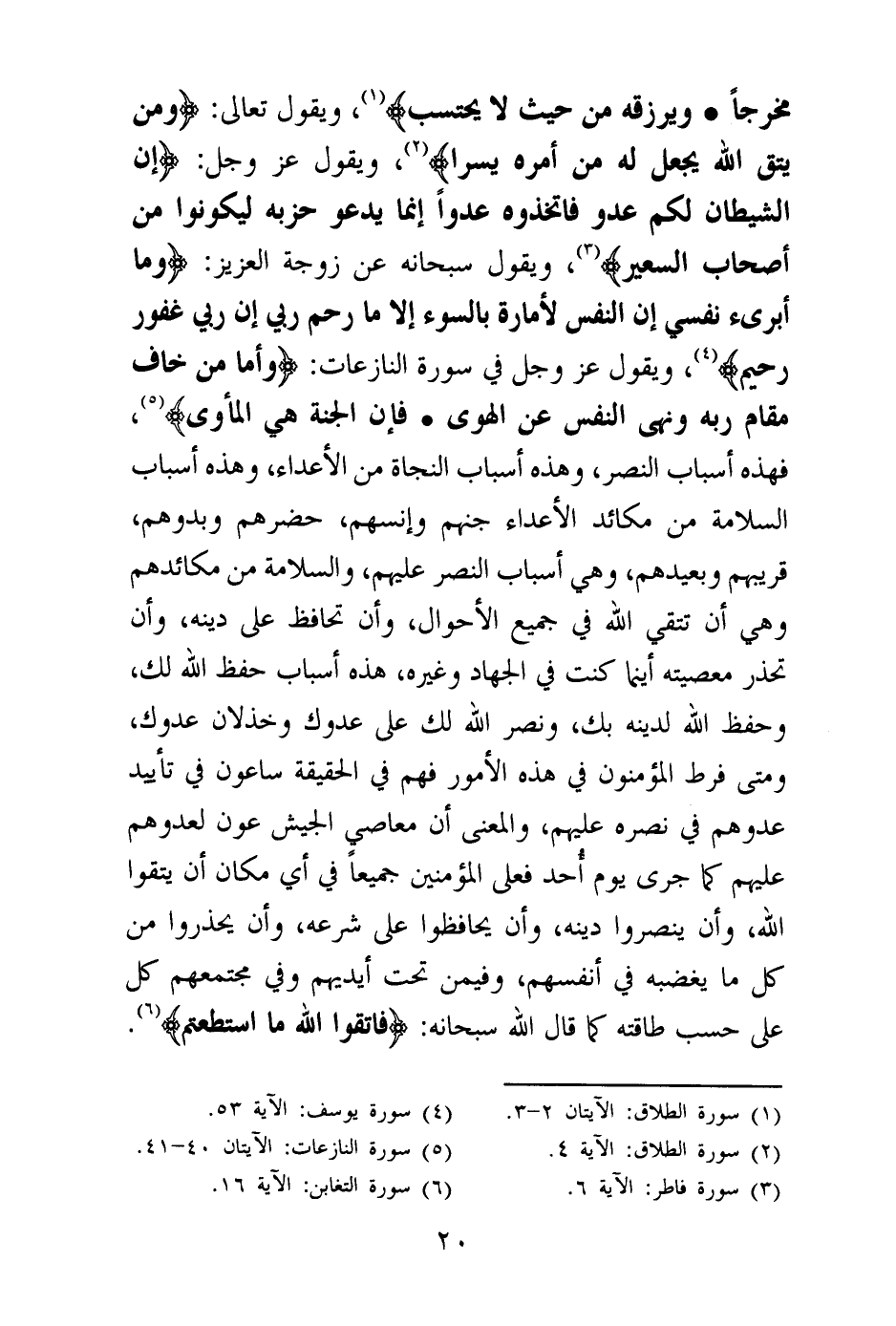 ويقول تعالى: {وَمَنْ يَتَّقِ اللَّهَ يَجْعَلْ لَهُ مِنْ أَمْرِهِ يُسْرًا} (¬1) ويقول عز وجل: {إِنَّ الشَّيْطَانَ لَكُمْ عَدُوٌّ فَاتَّخِذُوهُ عَدُوًّا إِنَّمَا يَدْعُو حِزْبَهُ لِيَكُونُوا مِنْ أَصْحَابِ السَّعِيرِ} (¬2) ويقول سبحانه عن زوجة العزيز: {وَمَا أُبَرِّئُ نَفْسِي إِنَّ النَّفْسَ لَأَمَّارَةٌ بِالسُّوءِ إِلَّا مَا رَحِمَ رَبِّي إِنَّ رَبِّي غَفُورٌ رَحِيمٌ} (¬3) يقول عز وجل في سورة النازعات: {وَأَمَّا مَنْ خَافَ مَقَامَ رَبِّهِ وَنَهَى النَّفْسَ عَنِ الْهَوَى} (¬4) {فَإِنَّ الْجَنَّةَ هِيَ الْمَأْوَى} (¬5) فهذه أسباب النصر، وهذه أسباب النجاة من الأعداء، وهذه أسباب السلامة من مكائد الأعداء جنهم وإنسهم، حضرهم وبدوهم، قريبهم وبعيدهم، وهي أسباب النصر عليهم، والسلامة من مكائدهم وهي أن تتقي الله في جميع الأحوال، وأن تحافظ على دينه، وأن تحذر معصيته أينما كنت في الجهاد وغيره، هذه أسباب حفظ الله لك، وحفظ الله لدينه بك، ونصر الله لك على عدوك وخذلان عدوك.