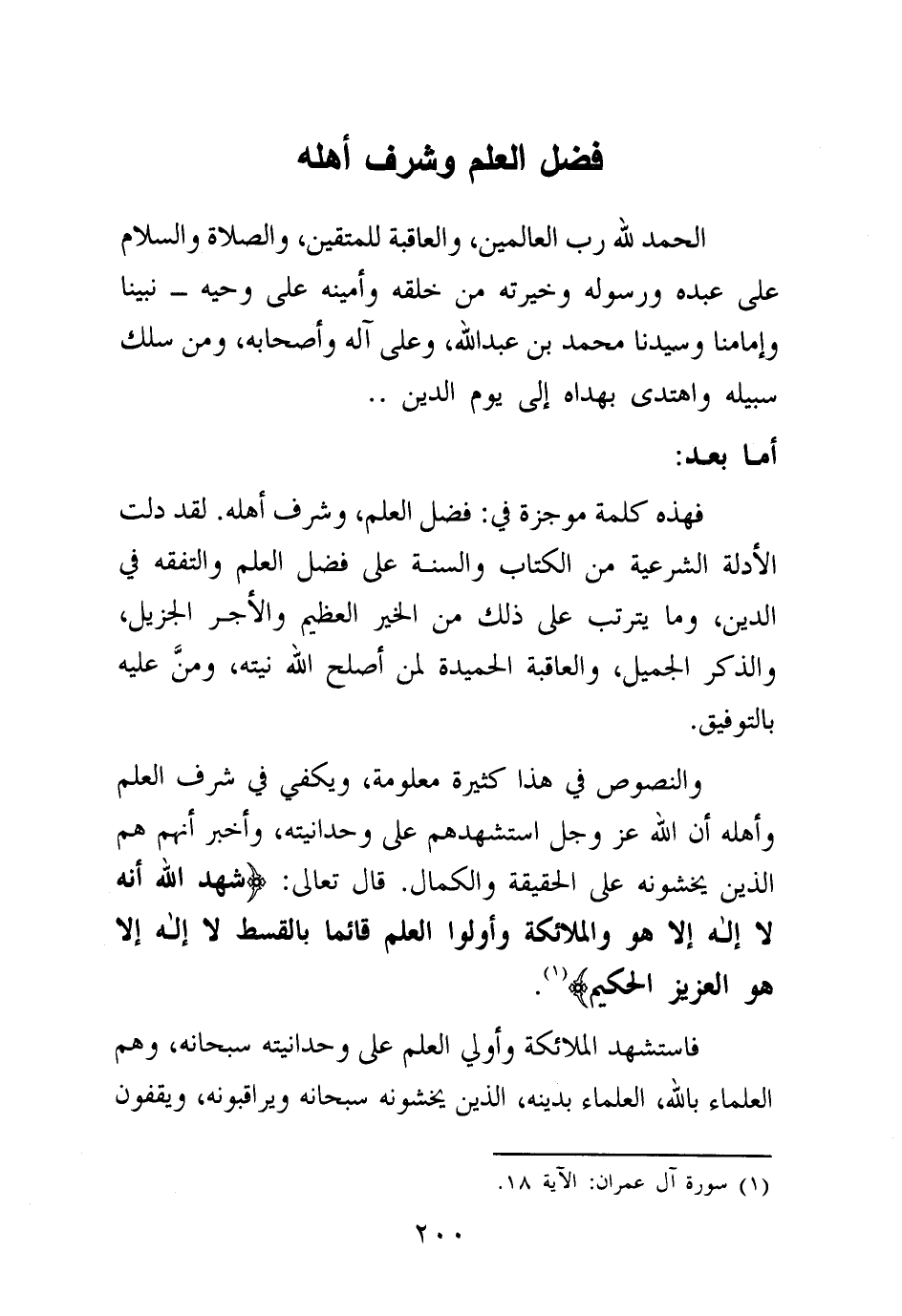 والنصوص في هذا كثيرة معلومة، ويكفي في شرف العلم وأهله أن الله عز وجل استشهدهم على وحدانيته، وأخبر أنهم هم الذين يخشونه على الحقيقة والكمال. قال تعالى: {شَهِدَ اللَّهُ أَنَّهُ لَا إِلَهَ إِلَّا هُوَ وَالْمَلَائِكَةُ وَأُولُو الْعِلْمِ قَائِمًا بِالْقِسْطِ لَا إِلَهَ إِلَّا هُوَ الْعَزِيزُ الْحَكِيمُ} (¬1)