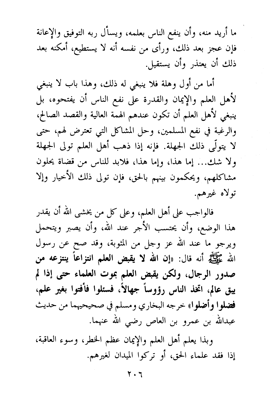 ما أريد منه، وأن ينفع الناس بعلمه، ويسأل ربه التوفيق والإعانة فإن عجز بعد ذلك، ورأى من نفسه أنه لا يستطيع، أمكنه بعد ذلك أن يعتذر وأن يستقيل. أما من أول وهلة فلا ينبغي له ذلك، وهذا باب لا ينبغي لأهل العلم والإيمان والقدرة على نفع الناس أن يفتحوه، بل ينبغي لأهل العلم أن تكون عندهم الهمة العالية والقصد الصالح، والرغبة في نفع المسلمين، وحل المشاكل التي تعترض لهم، حتى لا يتولى ذلك الجهلة. فإنه إذا ذهب أهل العلم تولى الجهلة ولا شك. . . إما هذا، وإما هذا، فلا بد للناس من قضاة يحلون مشاكلهم، ويحكمون بينهم بالحق، فإن تولى ذلك الأخيار وإلا تولاه غيرهم. فالواجب على أهل العلم، وعلى كل من يخشى الله أن يقدر هذا الوضع، وأن يحتسب الأجر عند الله، وأن يصبر ويتحمل ويرجو ما عند الله عز وجل من المثوبة، وقد صح عن رسول الله صلى الله عليه وسلم أنه قال: «إن الله لا يقبض العلم انتزاعا ينتزعه من صدور الرجال ولكن يقبض العلم بموت العلماء حتى إذا لم يبق عالم اتخذ الناس رءوسا جهالا فسئلوا فأفتوا بغير علم فضلوا وأضلوا (¬1) » ، خرجه البخاري ومسلم في صحيحيهما من حديث عبد الله بن عمرو بن العاص رضي الله عنهما.