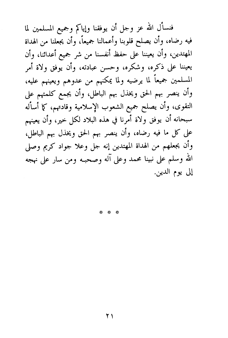 فنسأل الله عز وجل أن يوفقنا وإياكم وجميع المسلمين لما فيه رضاه، وأن يصلح قلوبنا وأعمالنا جميعا، وأن يجعلنا من الهداة المهتدين، وأن يعيننا على حفظ أنفسنا من شر جميع أعدائنا، وأن يعيننا على ذكره، وشكره، وحسن عبادته، وأن يوفق ولاة أمر المسلمين جميعا لما يرضيه ولما يمكنهم من عدوهم ويعينهم عليه، وأن ينصر بهم الحق ويخذل بهم الباطل، وأن يجمع كلمتهم على التقوى، وأن يصلح جميع الشعوب الإسلامية وقادتهم، كما أسأله سبحانه أن يوفق ولاة أمرنا في هذه البلاد لكل خير، وأن يعينهم على كل ما فيه رضاه، وأن ينصر بهم الحق ويخذل بهم الباطل، وأن يجعلهم من الهداة المهتدين إنه جل وعلا جواد كريم وصلى الله وسلم على نبينا محمد وعلى آله وصحبه ومن سار على نهجه إلى يوم الدين.