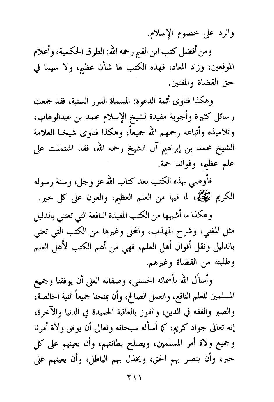وهكذا فتاوى أئمة الدعوة: المسماة الدرر السنية، فقد جمعت رسائل كثيرة وأجوبة مفيدة لشيخ الإسلام محمد بن عبد الوهاب، وتلاميذه وأتباعه رحمهم الله جميعا، وهكذا فتاوى شيخنا العلامة الشيخ محمد بن إبراهيم آل الشيخ رحمه الله، فقد اشتملت على علم عظيم، وفوائد جمة. فأوصي بهذه الكتب بعد كتاب الله عز وجل، وسنة رسوله الكريم صلى الله عليه وسلم، لما فيها من العلم العظيم، والعون على كل خير. وهكذا ما أشبهها من الكتب المفيدة النافعة التي تعتني بالدليل مثل المغني، وشرح المهذب، والمحلى وغيرها من الكتب التي تعنى بالدليل ونقل أقوال أهل العلم، فهي من أهم الكتب لأهل العلم وطلبته من القضاة وغيرهم. وأسأل الله بأسمائه الحسنى، وصفاته العلى أن يوفقنا وجميع المسلمين للعلم النافع، والعمل الصالح، وأن يمنحنا جميعا النية الخالصة، والصبر والفقه في الدين، والفوز بالعاقبة الحميدة في الدنيا والآخرة، إنه تعالى جواد كريم، كما أسأله سبحانه وتعالى أن يوفق ولاة أمرنا وجميع ولاة أمر المسلمين، ويصلح بطانتهم، وأن يعينهم على كل خير، وأن ينصر بهم الحق، ويخذل بهم الباطل، وأن يعينهم على