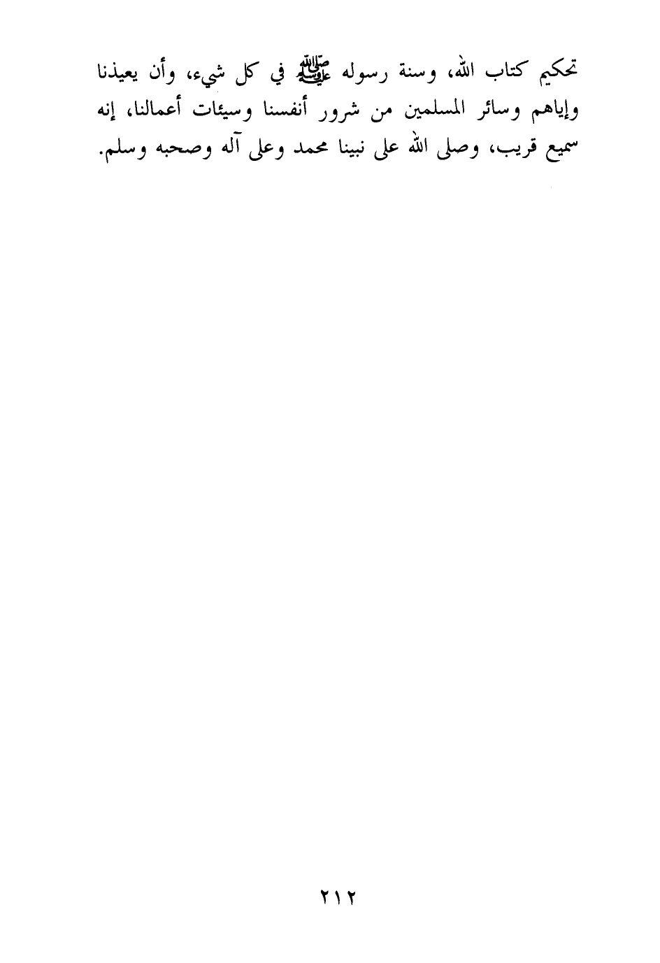 تحكيم كتاب الله، وسنة رسوله صلى الله عليه وسلم في كل شيء، وأن يعيذنا وإياهم وسائر المسلمين من شرور أنفسنا وسيئات أعمالنا، إنه سميع قريب، وصلى الله على نبينا محمد وعلى آله وصحبه وسلم.