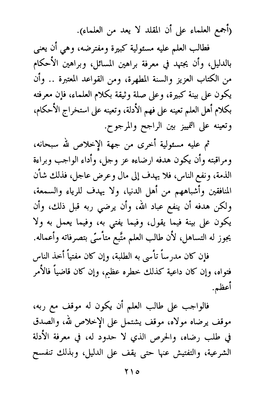 فطالب العلم عليه مسئولية كبيرة ومفترضة، وهي أن يعنى بالدليل، وأن يجتهد في معرفة براهين المسائل، وبراهين الأحكام من الكتاب العزيز والسنة المطهرة، ومن القواعد المعتبرة. . وأن يكون على بينة كبيرة، وعلى صلة وثيقة بكلام العلماء، فإن معرفته بكلام أهل العلم تعينه على فهم الأدلة، وتعينه على استخراج الأحكام، وتعينه على التمييز بين الراجح والمرجوح.